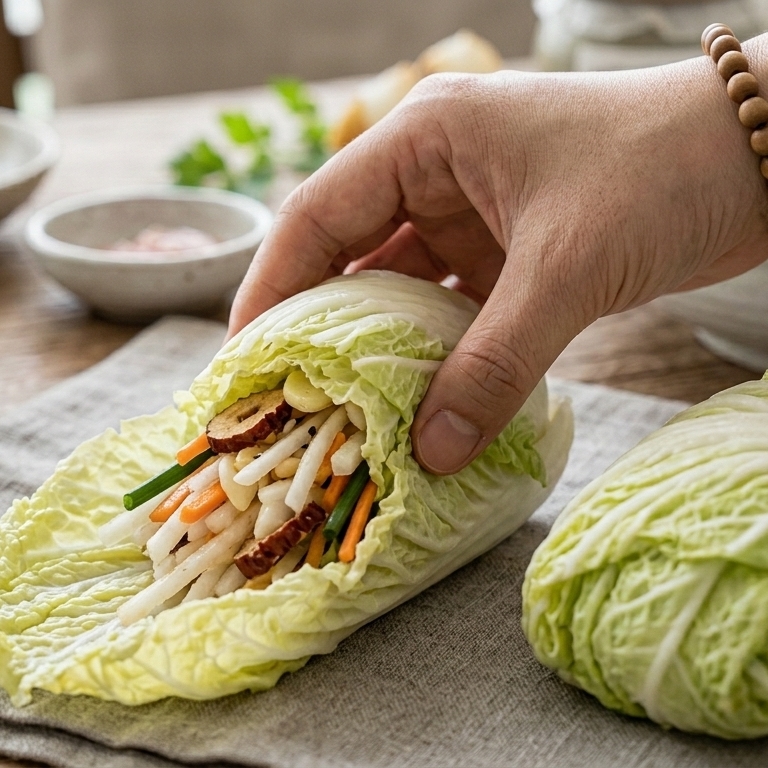 * 무쌈말이: 알록달록한 채소를 넣은 무쌈말이는 시각적으로 화려합니다. 빨간 김치 대신 백김치를 곁들이면 무쌈의 파스텔톤 색감을 그대로 살리면서 뒷맛을 깔끔하게 잡아줍니다.
