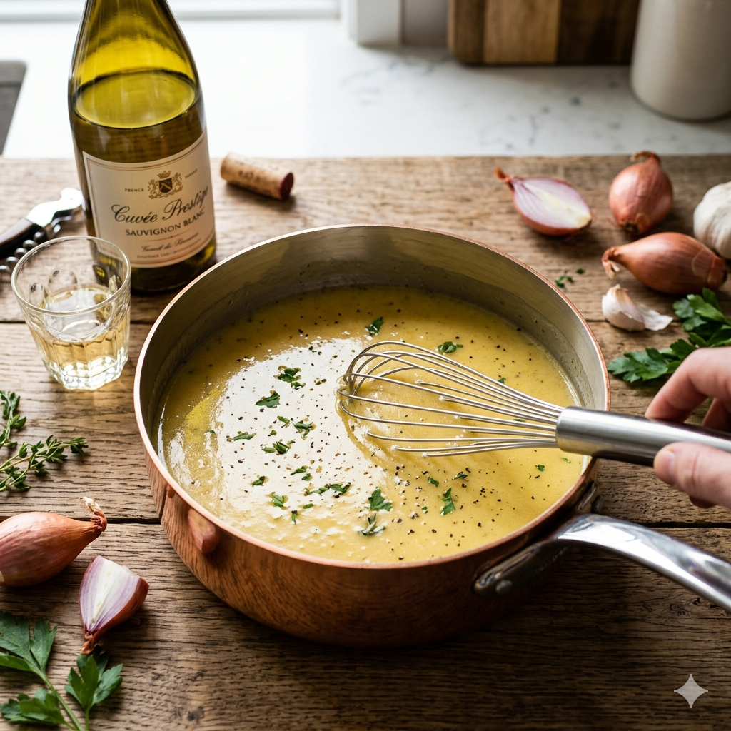 단순히 섞는 것이 아니라, 와인의 산미를 잡고 버터의 고소함을 유화(Emulsion)시키는 전문적인 기법을 담았습니다.