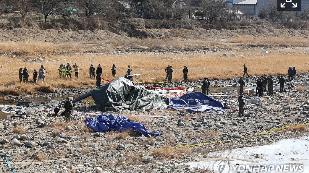 사고 현장은 군과 경찰, 소방 당국에 의해 통제되었으며, 헬기 동체는 방수포로 덮인 채 수습 중입니다.