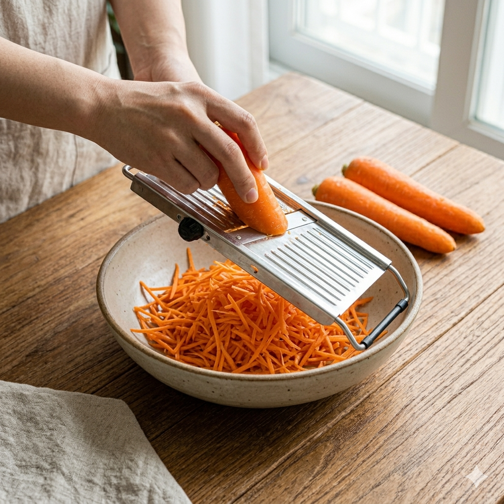 * 당근은 깨끗이 씻어 껍질을 벗긴 후, 채칼을 이용해 얇게 채 썰어줍니다.