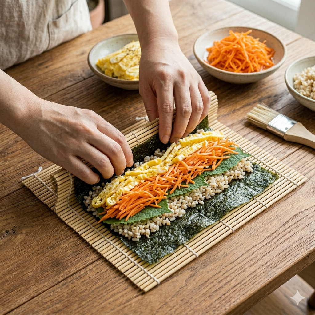 여기에 단백질 공급원인 계란 지단을 듬뿍 넣어 '밥 없는 김밥' 형태로 말아주면, 혈당 스파이크를 방지하면서도 포만감을 오래 유지할 수 있는 완벽한 저탄수화물 고단백 식단이 완성됩니다.