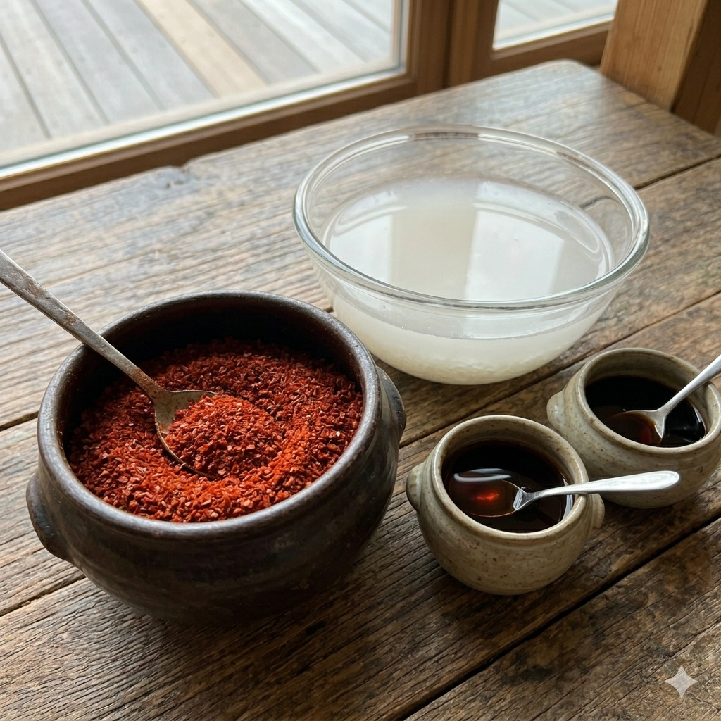 * 육수 및 양념: 쌀뜨물 500ml, 고춧가루 2큰술, 국간장 1큰술, 멸치액젓 1큰술, 다진 마늘 1큰술, 설탕 0.5큰술(산도 조절용), 들기름 1큰술