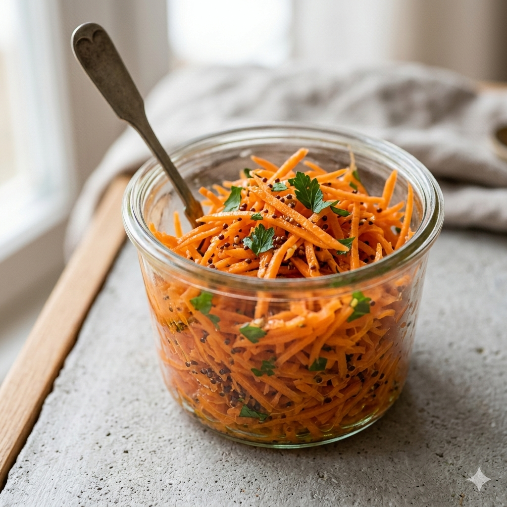 이때 당근의 선명한 주황색과 머스터드 씨앗이 어우러지며 시각적인 미감이 살아납니다.