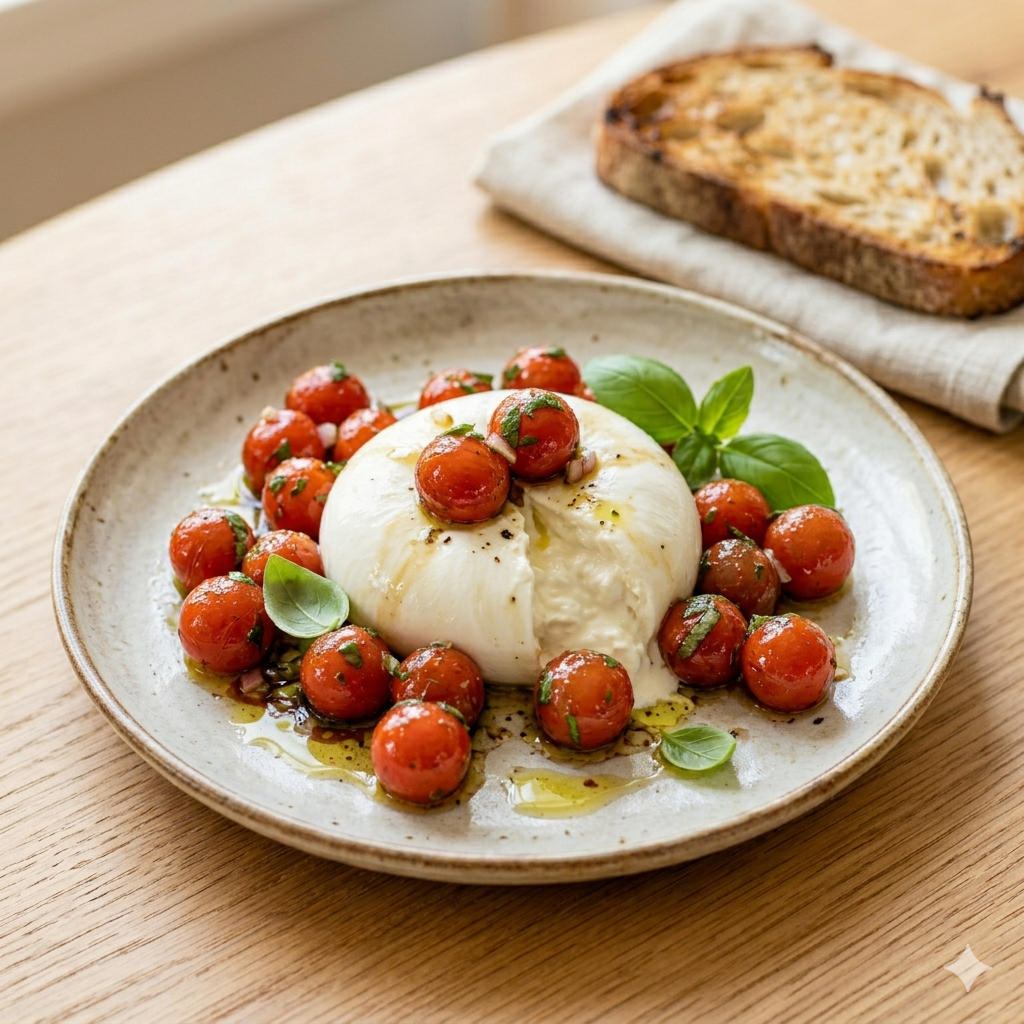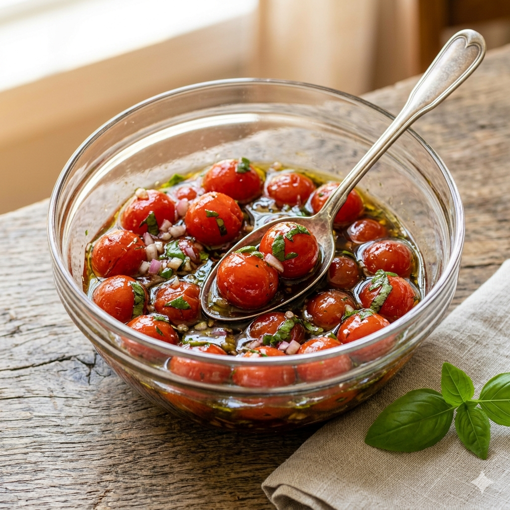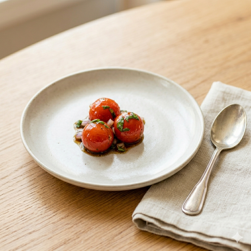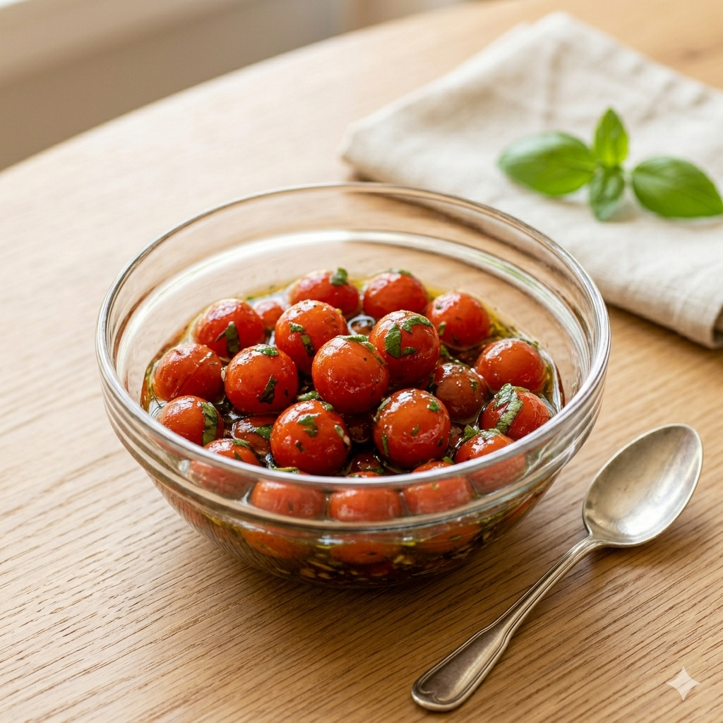 단순히 토마토를 설탕에 절이는 방식과는 차원이 다른 고급스러운 산미와 허브의 향긋함이 어우러진 이 요리는, 이탈리안 레스토랑의 수준 높은 에피타이저를 집에서도 완벽하게 재현할 수 있게 해줍니다.