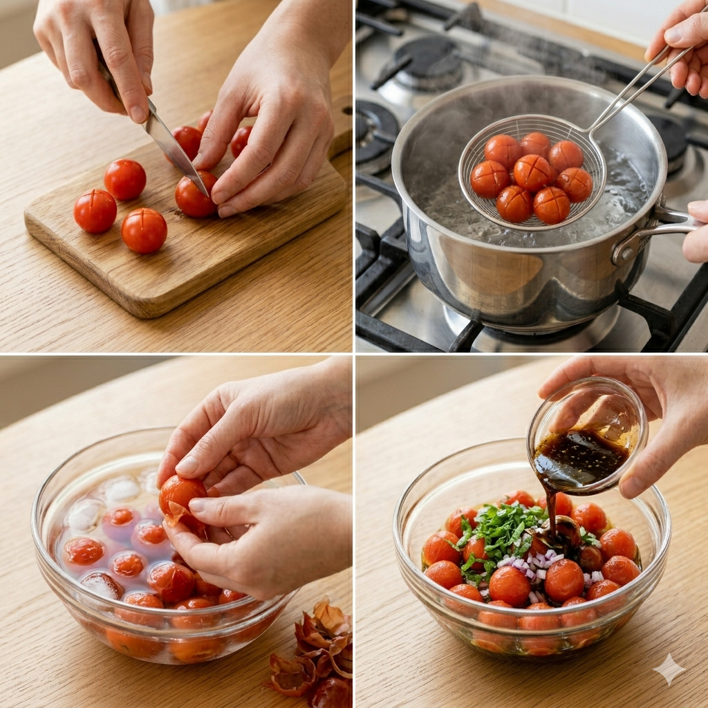 끓는 물에 소금을 약간 넣고, 칼집 낸 토마토를 10~20초간 빠르게 데칩니다.