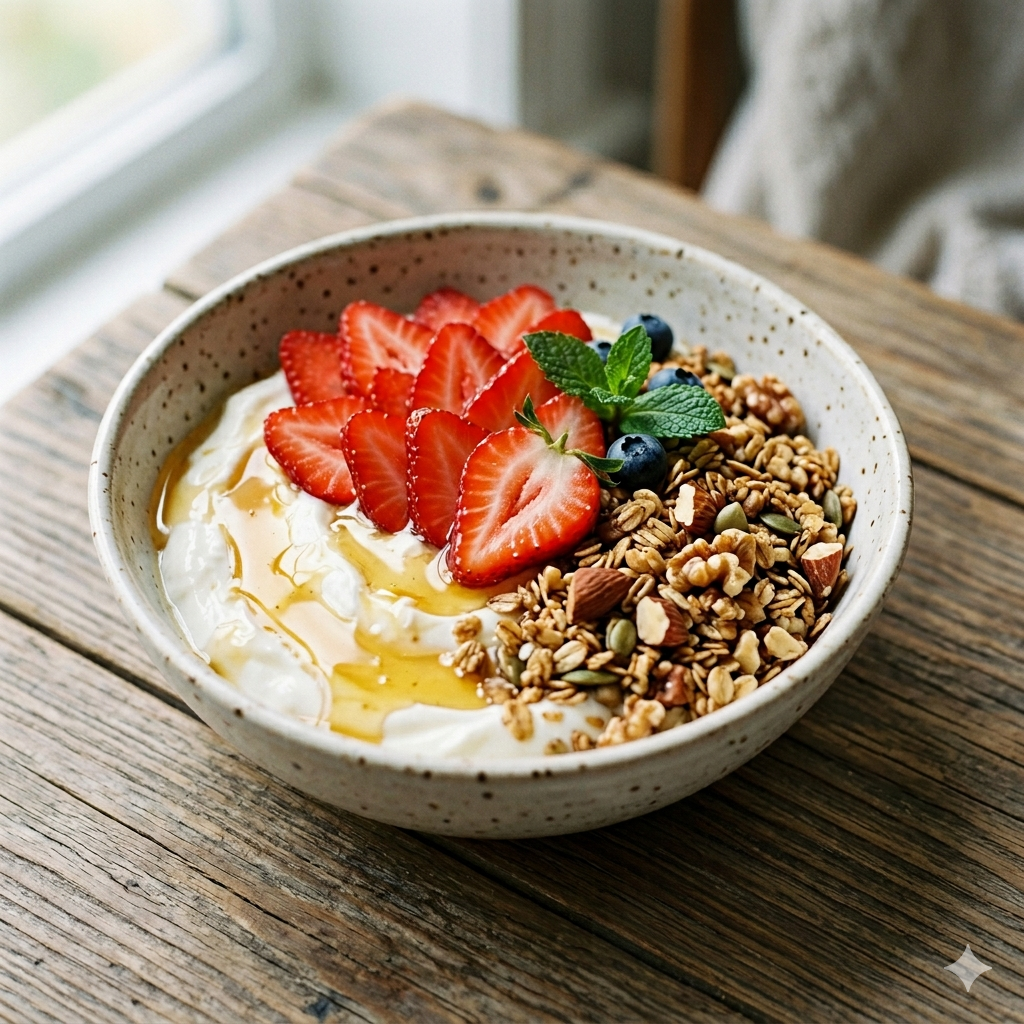 신선한 딸기와 그릭 요거트, 견과류, 그래놀라의 조화는 맛뿐만 아니라 영양학적으로도 훌륭합니다.