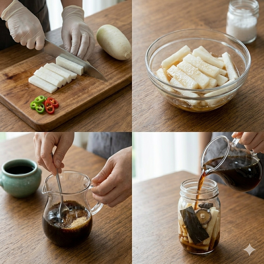 * 재료: 무 2개(약 3kg), 간장 4컵, 설탕 3컵, 식초 3컵, 소주 1컵, 물 2컵.