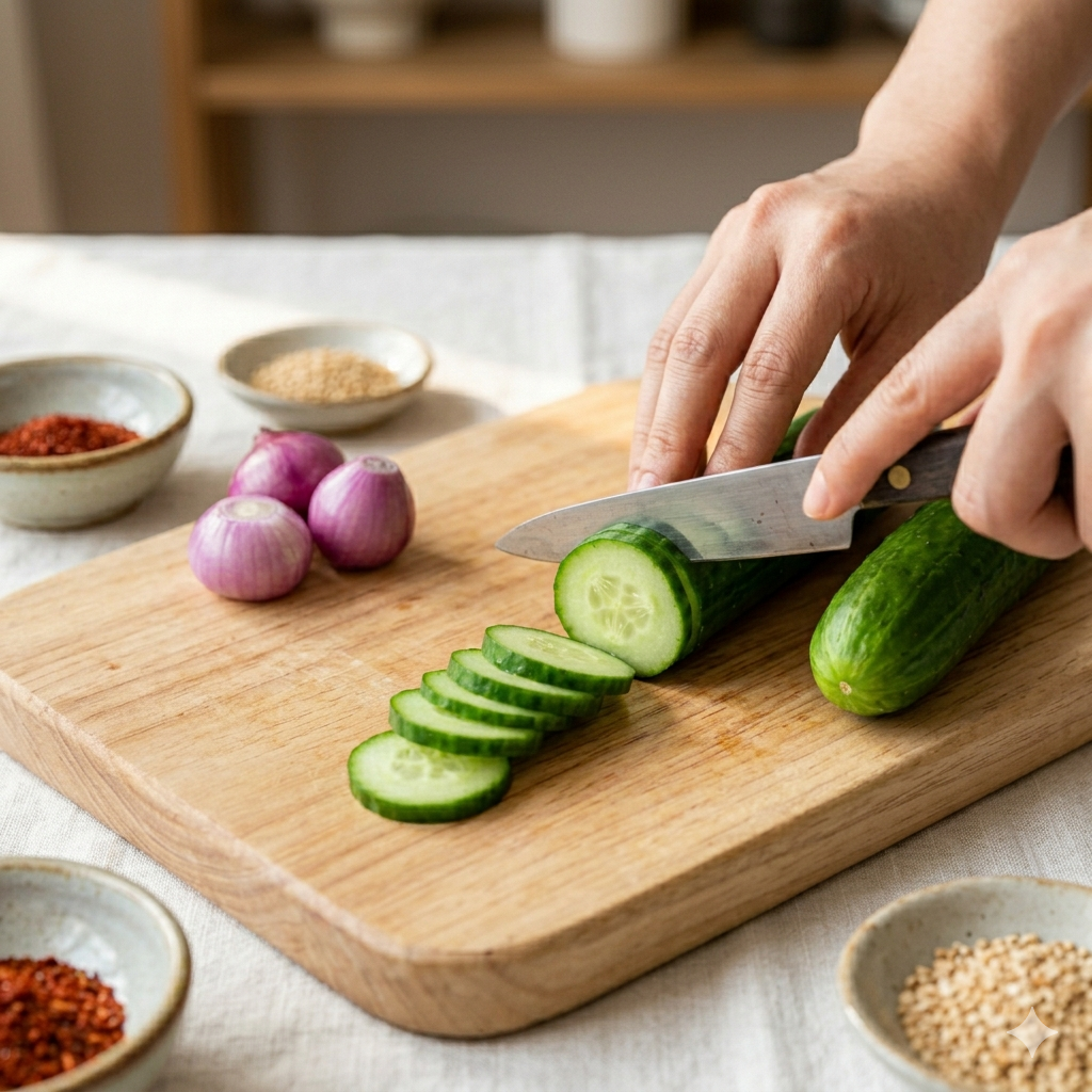 오이는 0.5cm 두께로 동글동글하게 썰거나, 투박하게 어긋썰기를 하면 양념이 더 잘 배어듭니다.