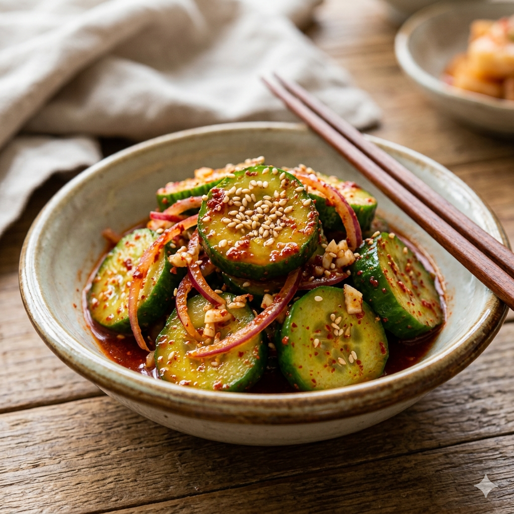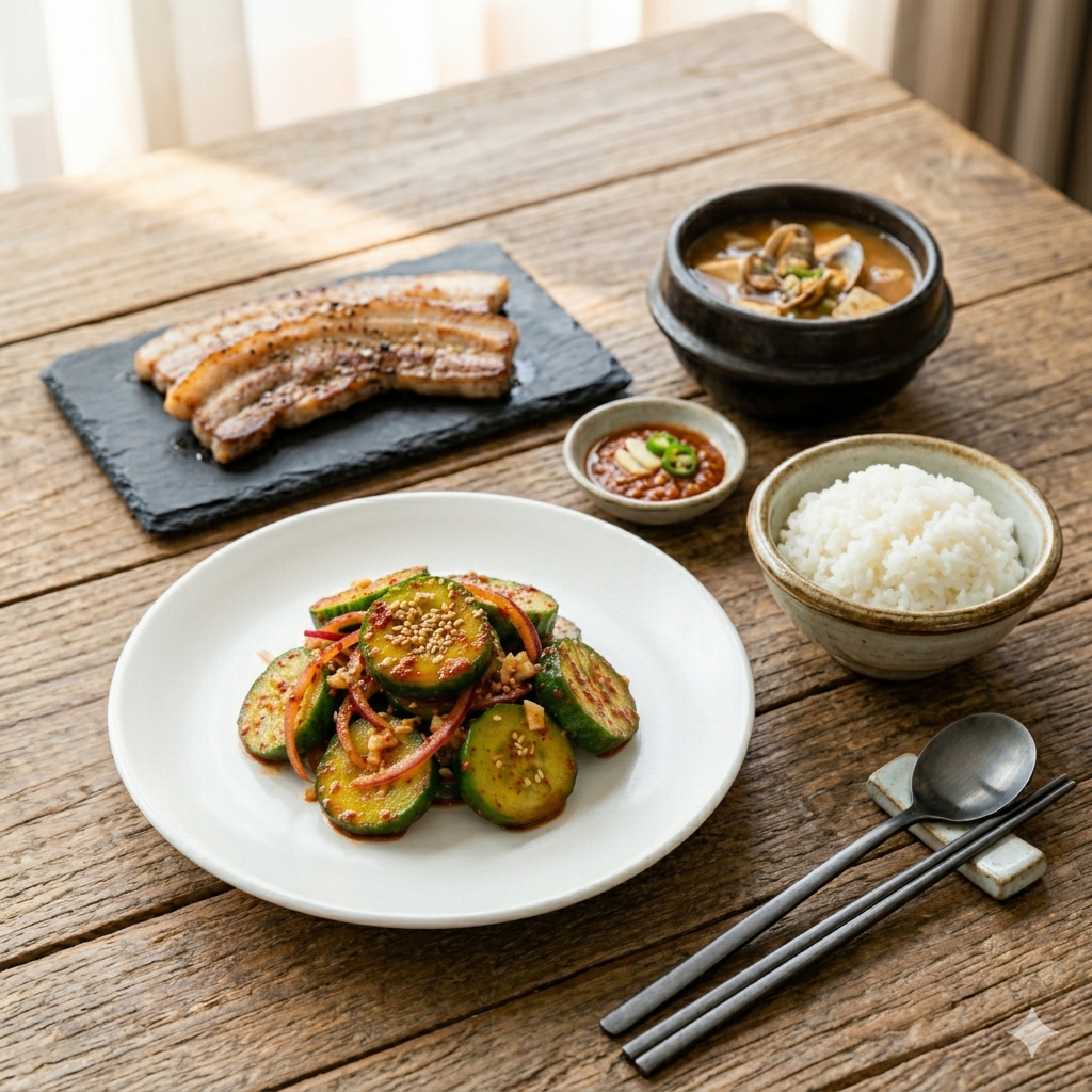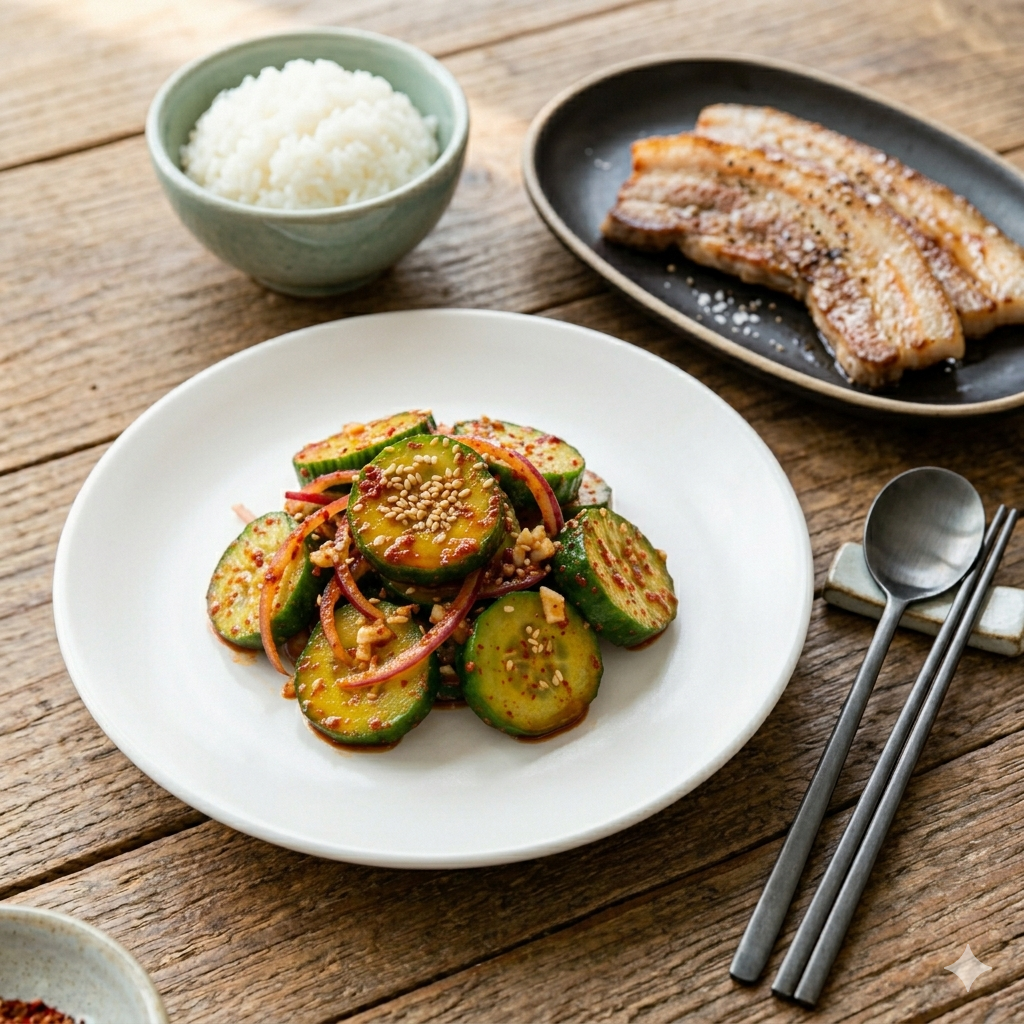 * 삼겹살 및 차돌박이: 기름진 돼지고기 요리에 오이무침의 산뜻함은 최고의 궁합입니다. 파채 대신 오이무침을 곁들여 보세요.