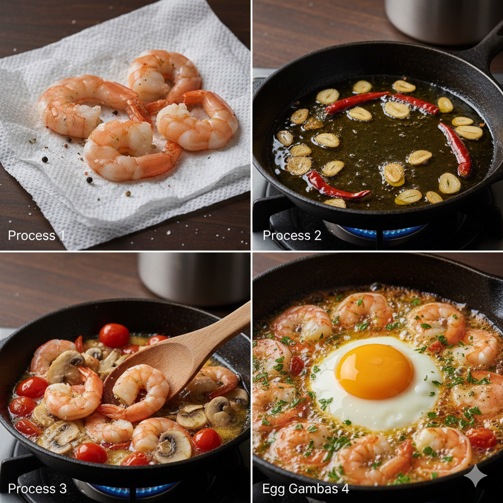 특히 오늘은 일반적인 새우 감바스에 계란 반숙(에그 인 헬 스타일)을 곁들여 풍미를 극대화한 특별한 변주 레시피까지 포함해 준비해 보았습니다.