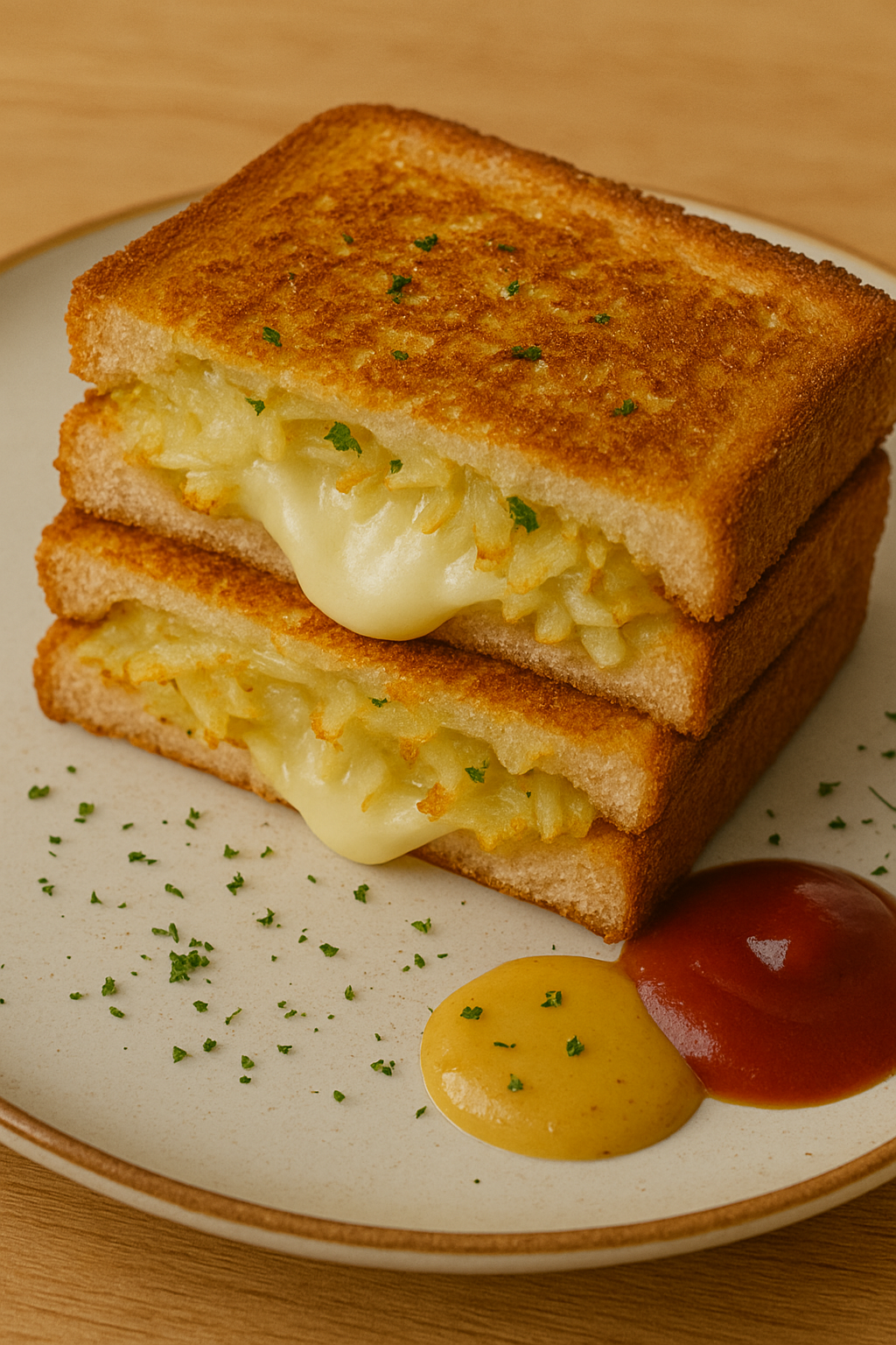 반으로 잘라 접시에 담고, 케첩이나 머스타드를 곁들이면 맛있는 감자토스트가 완성됩니다.
