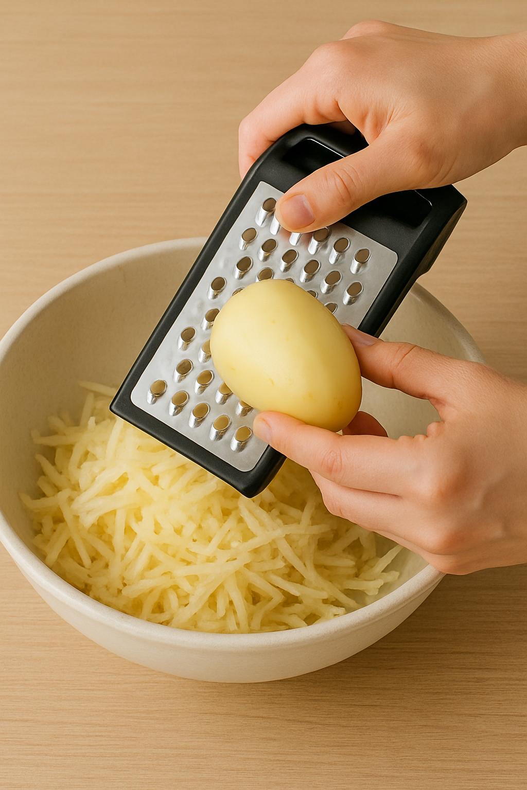 감자의 껍질을 벗기고 채 썹니다. 강판에 갈아 사용해도 좋습니다. 채 썬 감자는 소금에 5분간 절여 물기를 제거하면 더 바삭해집니다.