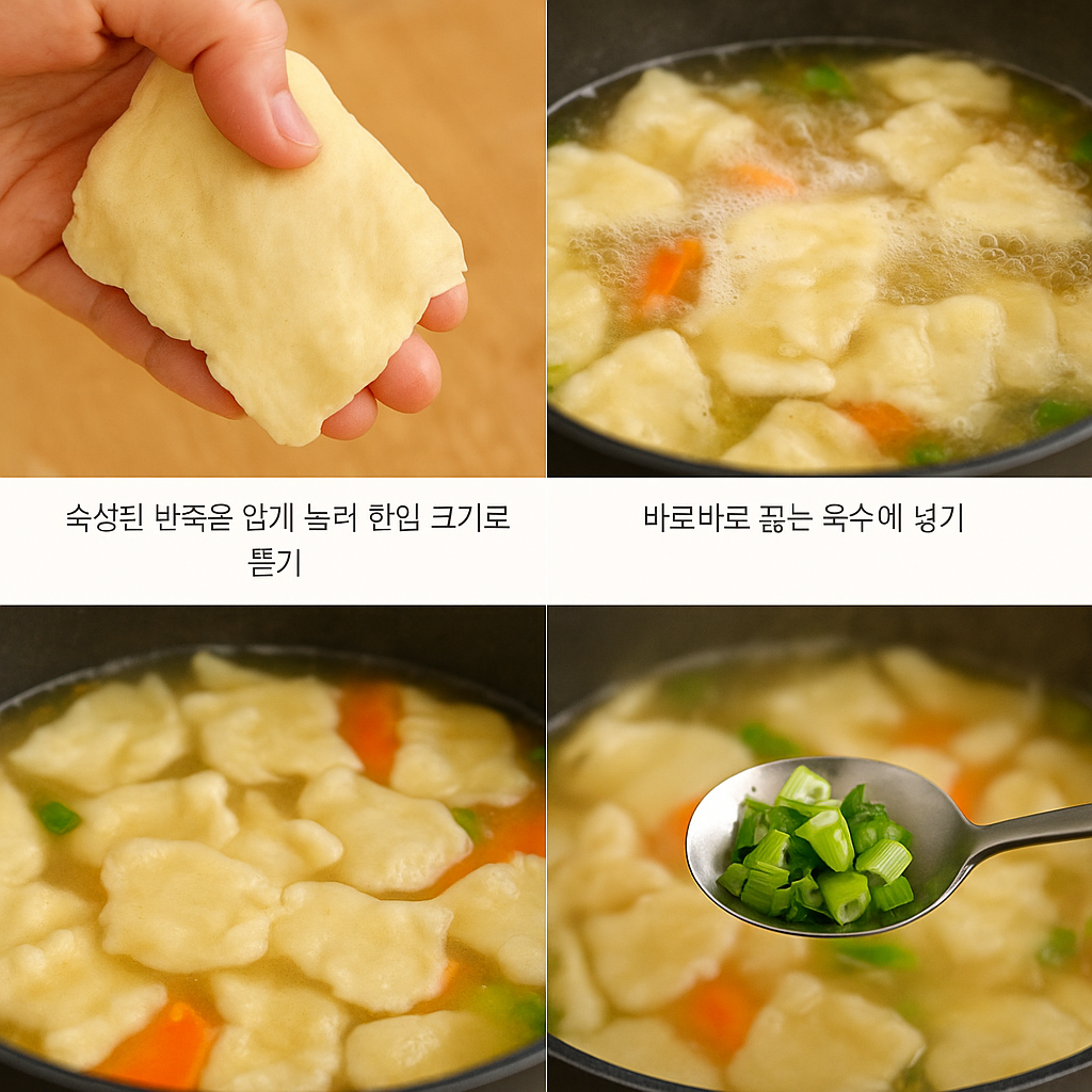 1. 반죽을 얇게 펼치고 한입 크기로 뜯어 끓는 육수에 바로 넣기