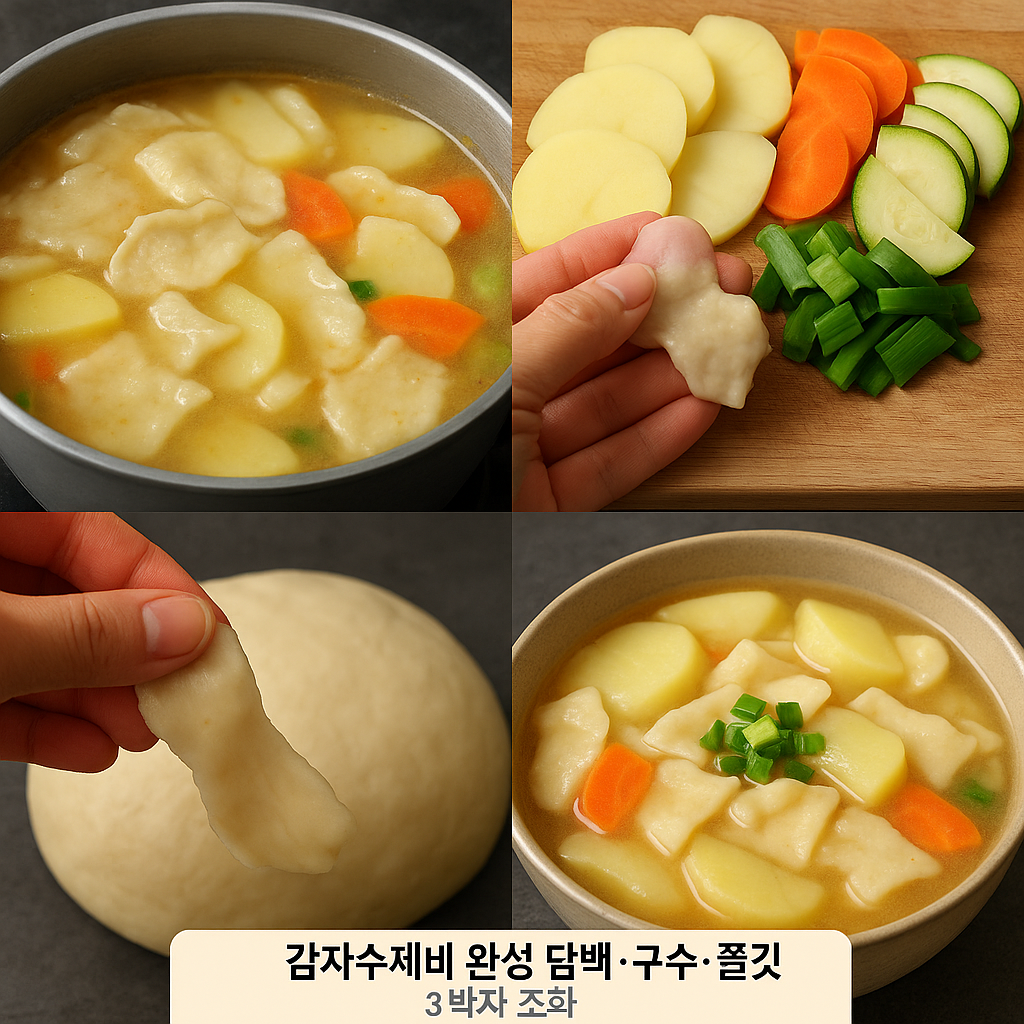 감자수제비의 핵심은 ‘반죽’과 ‘육수’입니다. 풍미 있는 국물과 쫀득한 수제비질감을 만들려면 재료 선택 단계에서부터 정확한 비율이 중요합니다.