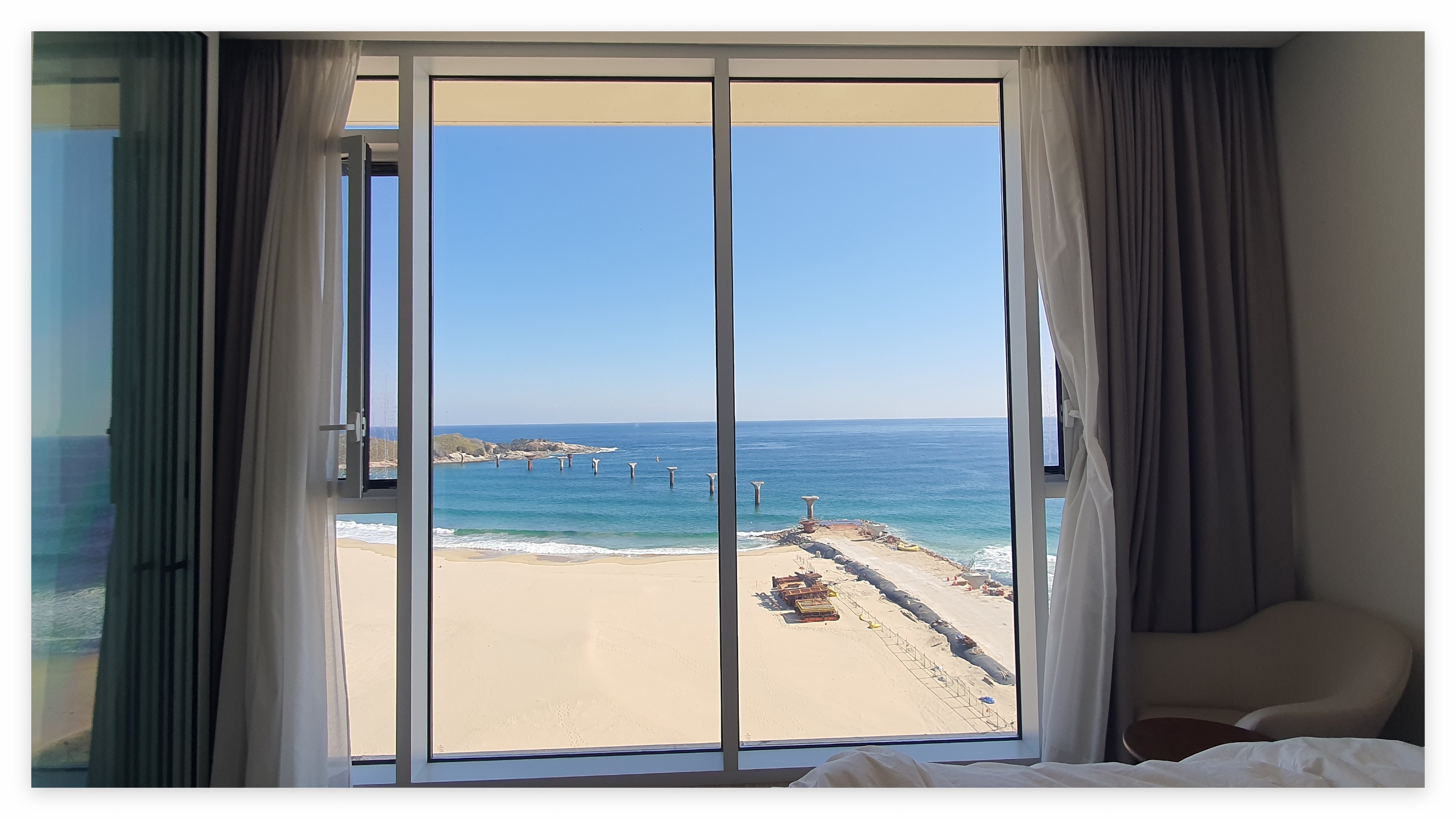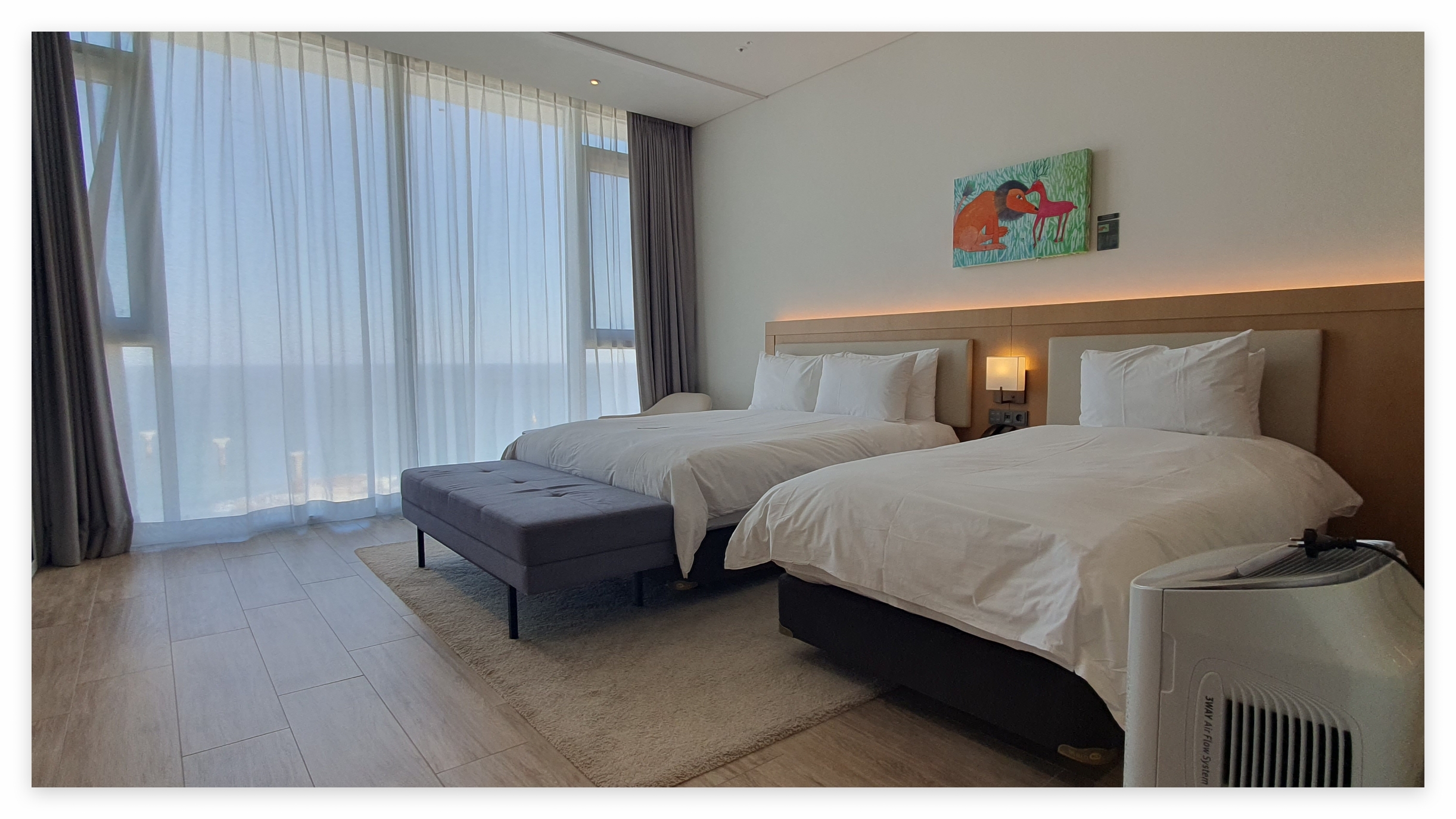 전 객실의 전면 통유리창을 통해 들어오는 자연광은 객실을 더욱더 아늑하게 만들어 주었으며, 바다를 바라보며 여유로운 시간을 보낼 수 있어 가족 여행으로도 매우 적합한 선택이었고, 그리고 강력히 추천드려요.