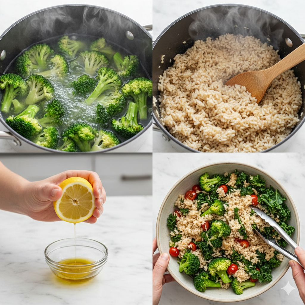 * 충분히 불린 현미 1컵, 케일 3장, 브로콜리 1/2송이, 방울토마토 5알, 레몬즙 1큰술, 올리브유 2큰술, 소금 한 꼬집.