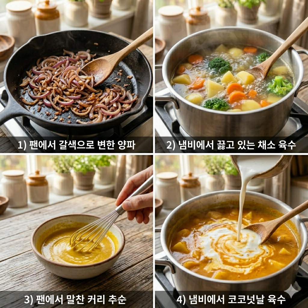 불을 잠시 끄거나 아주 약하게 줄인 뒤, 카레 가루를 조금씩 나누어 넣으며 풀어줍니다. 가루가 뭉치지 않게 저어준 뒤, 다시 불을 켜고 코코넛 밀크를 넣어 부드러운 질감을 완성합니다.