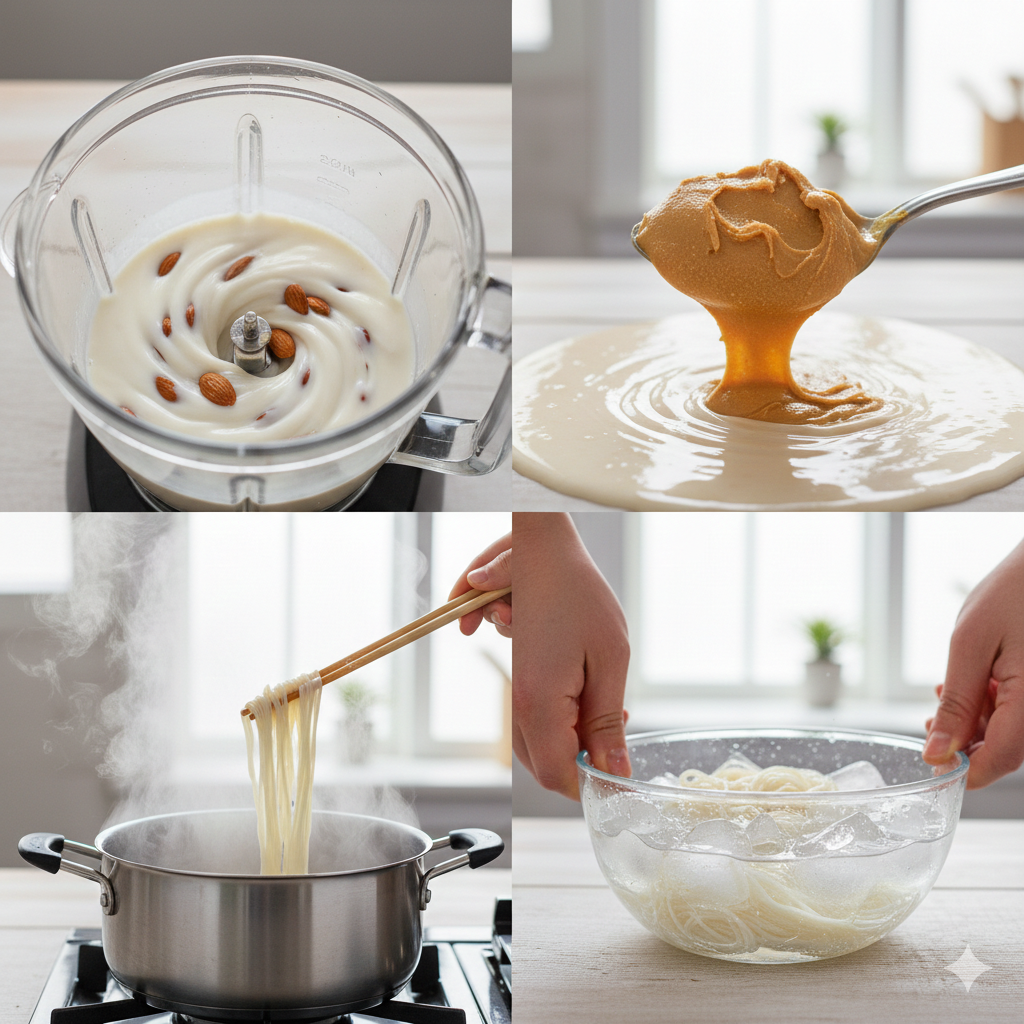 오늘은 번거롭게 콩을 불리고 삶는 과정 없이, 아몬드 가루와 땅콩버터를 활용해 단 10분 만에 전문점 수준의 깊고 진한 맛을 내는 ‘아몬드 땅콩 콩국수’ 황금 레시피를 소개해 드립니다.