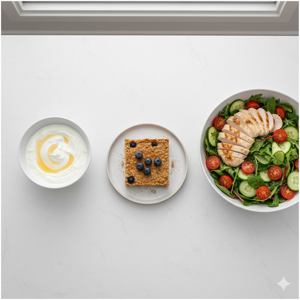 구운 오트밀 + 그릭 요거트 1스쿱 | 연어 포케 (현미밥 베이스, 소스 최소화) | 토마토 달걀 볶음 + 호밀빵 1쪽
