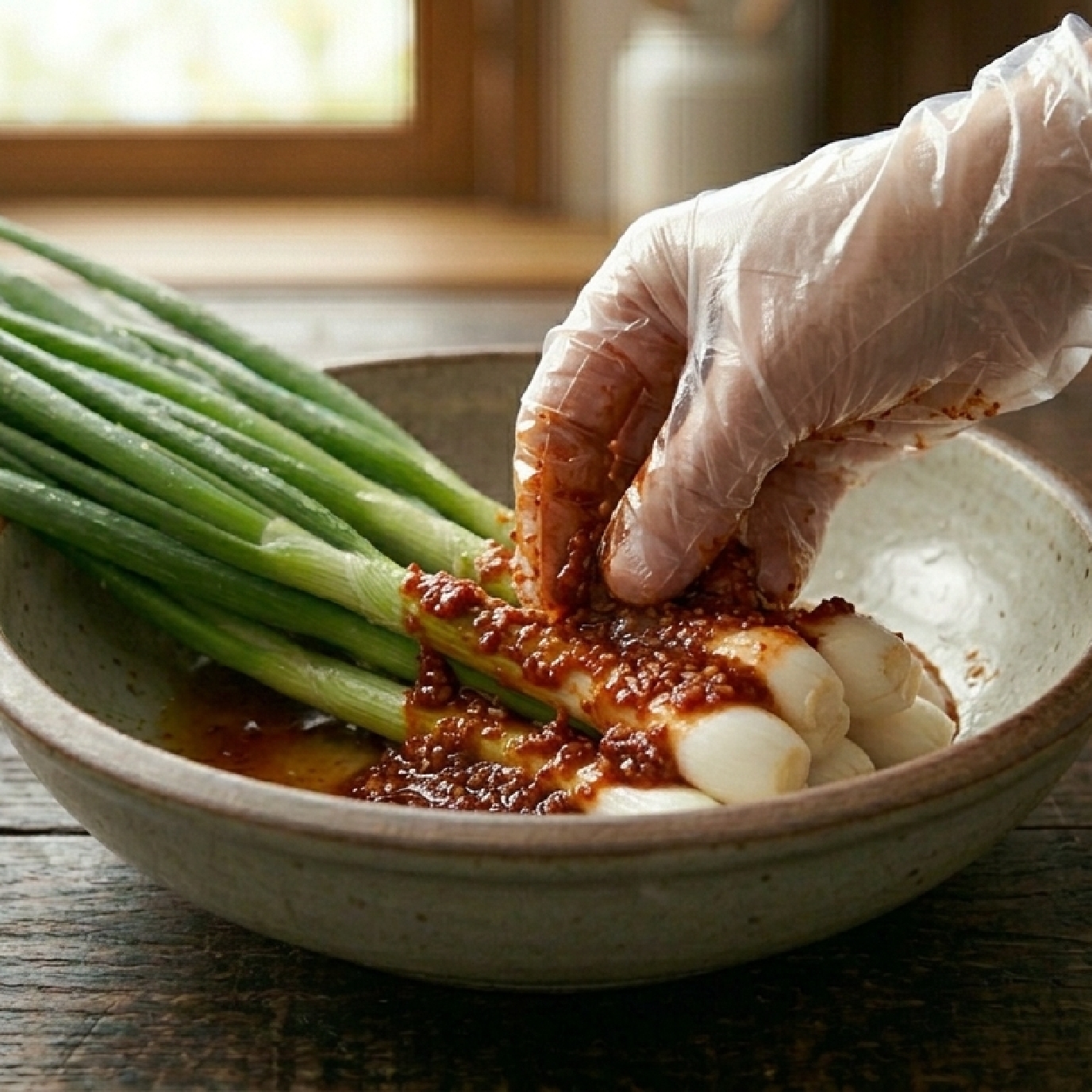 * 버무리기: 절여진 쪽파의 머리 부분부터 양념을 꼼꼼히 바르고, 나머지 잎 부분은 손으로 가볍게 훑듯이 양념을 입혀줍니다. 너무 세게 치대면 풋내가 날 수 있으니 주의하십시오.