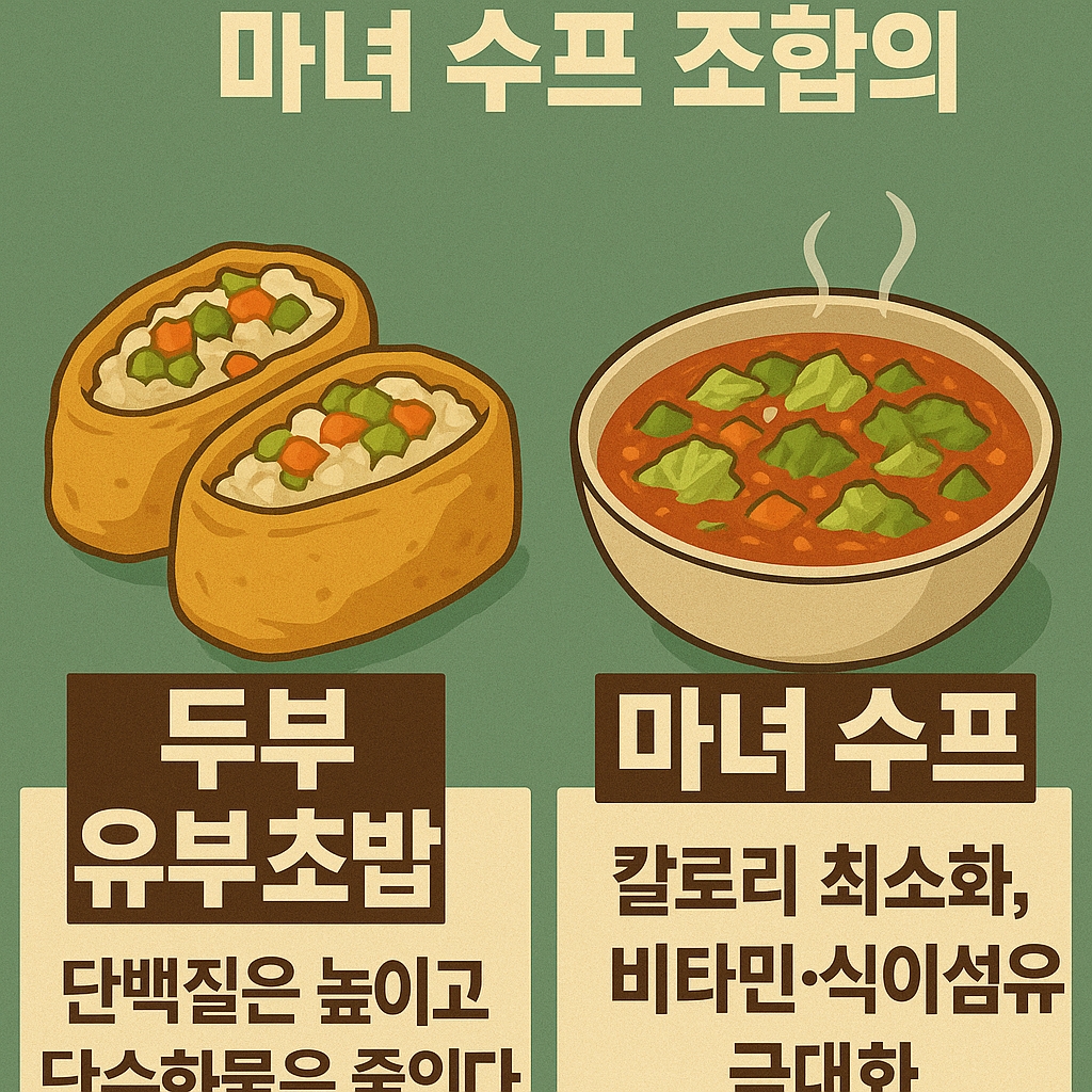 두부 유부초밥은 단백질 보충에 강점이 있고, 마녀 수프는 열량 조절과 비타민 보충에 탁월합니다.