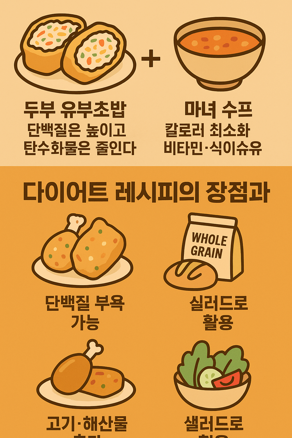 두부 유부초밥은 단백질 보충에 강점이 있고, 마녀 수프는 열량 조절과 비타민 보충에 탁월합니다.