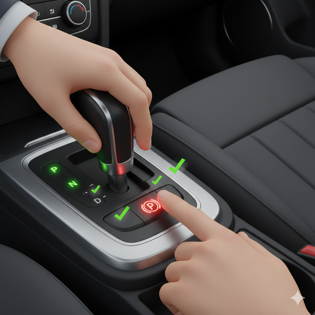 : 차량을 완전히 정차한 후에는 반드시 기어를 P(주차)에 두고, 전자식 주차 브레이크(EPB) 또는 수동식 사이드 브레이크를 체결하여 차량이 움직이지 않도록 이중 안전장치를 확보해야 합니다.