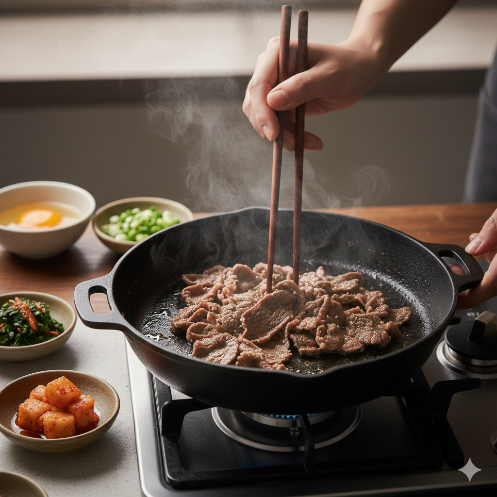 육수가 끓는 동안 고명을 준비합니다. 소고기는 결대로 얇게 채 썰어 간장, 설탕, 참기름으로 밑간한 뒤 팬에 노릇하게 볶아냅니다.