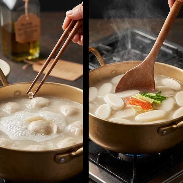 깔끔한 국물의 비결: 떡을 넣은 후에는 전분이 과하게 나오지 않도록 너무 자주 젓지 않는 것이 포인트입니다.