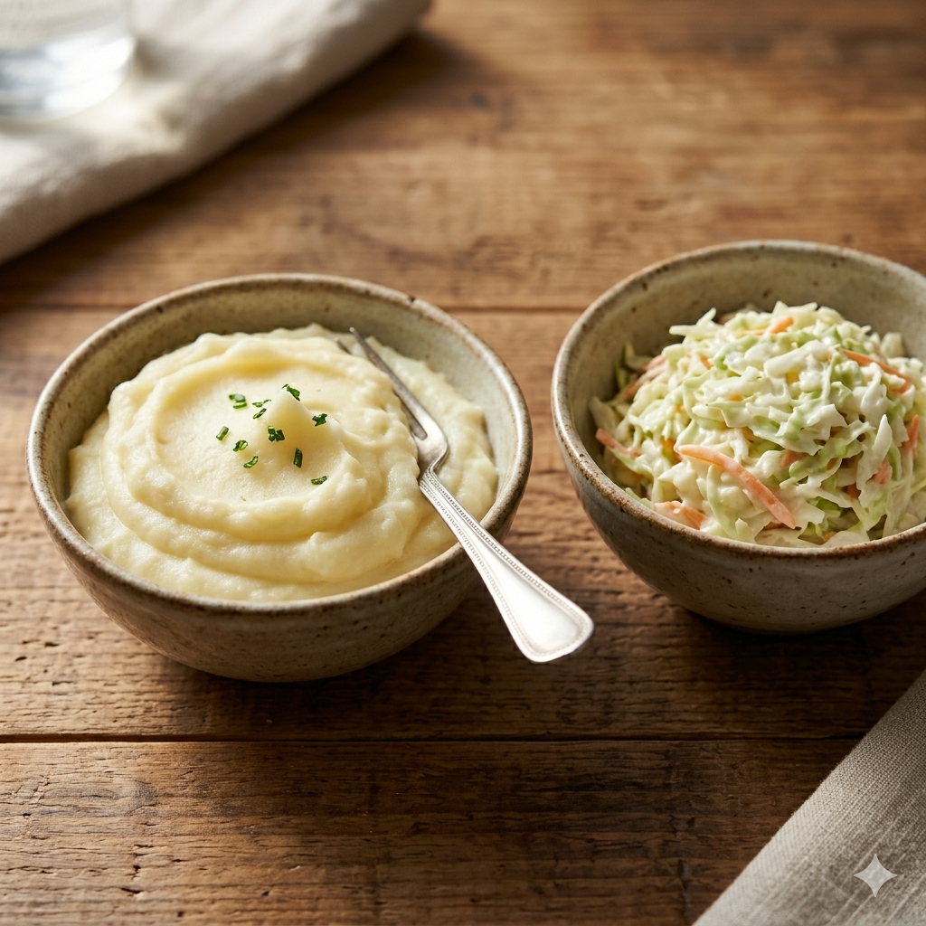 2. 코울슬로 또는 코니숑: 소스의 묵직함을 잡아줄 상큼한 피클류나 양배추 샐러드가 필수입니다.