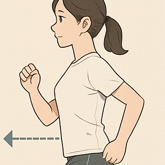 팔은 직각으로 유지해 앞뒤로 자연스럽게 움직이고, 턱은 살짝 당겨 시선을 18~20m 전방에 둔다.