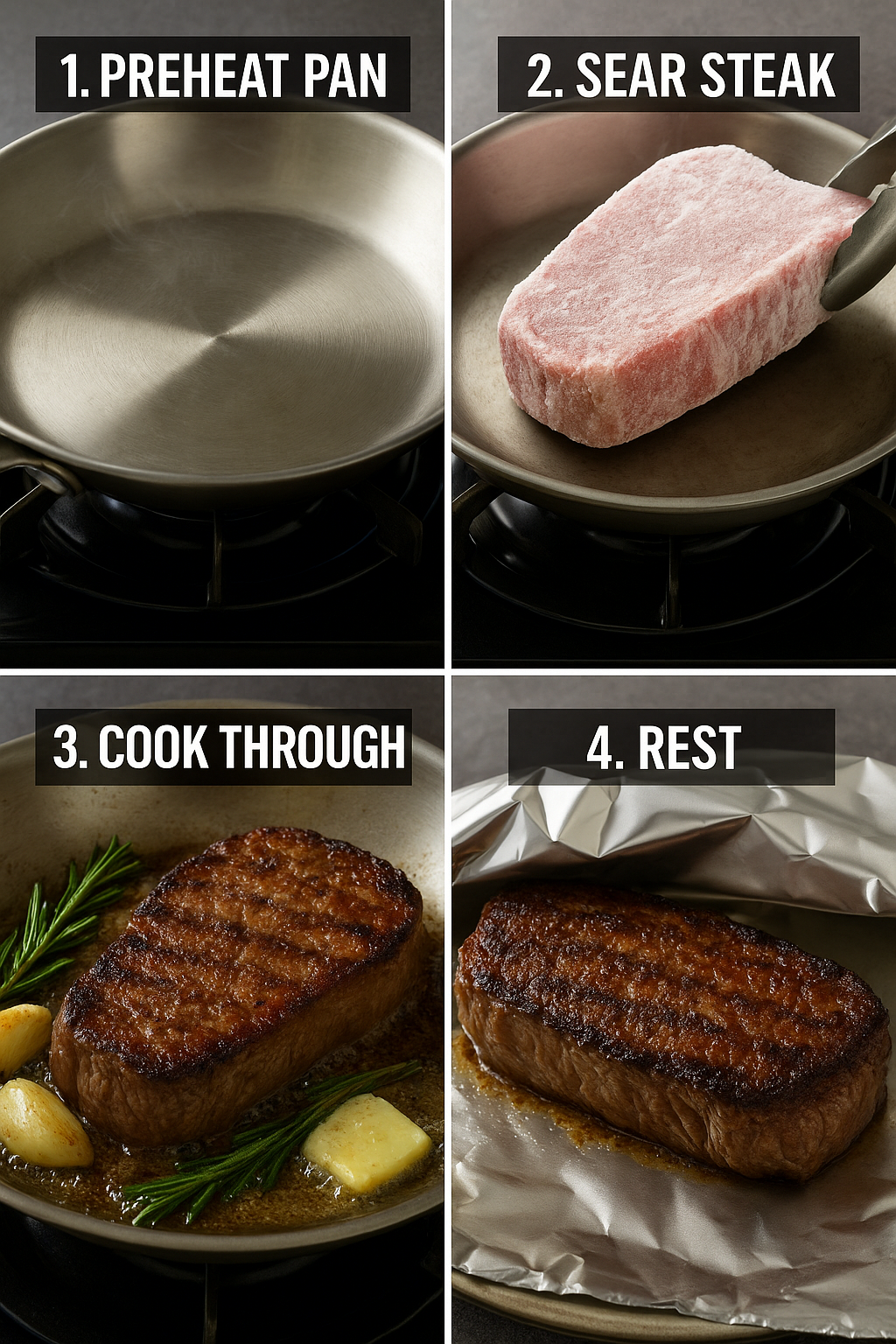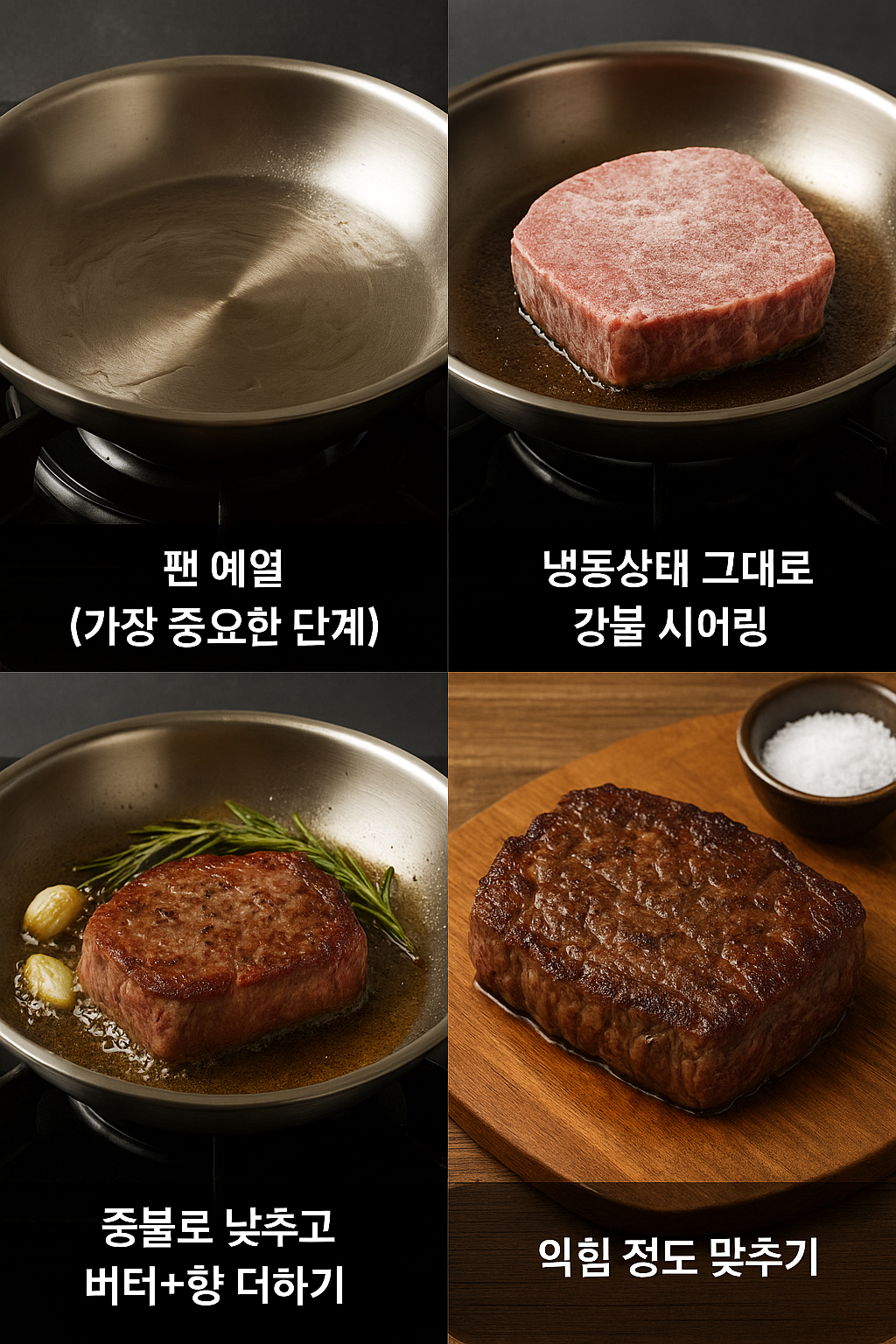 냉동 스테이크를 성공적으로 굽는 핵심은 예열–시어링–중불 익힘–레스팅 이 네 단계입니다.