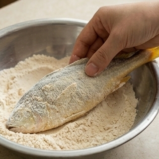 가루를 얇게 입히면 생선 살이 부서지는 것을 방지하고 표면을 더욱 바삭하게 만들어줍니다.