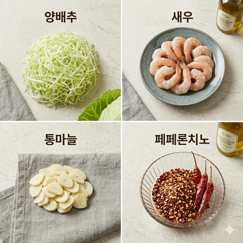 * 메인 재료: 양배추 1/4통 (약 200g), 자숙 새우 또는 생새우 8~10마리