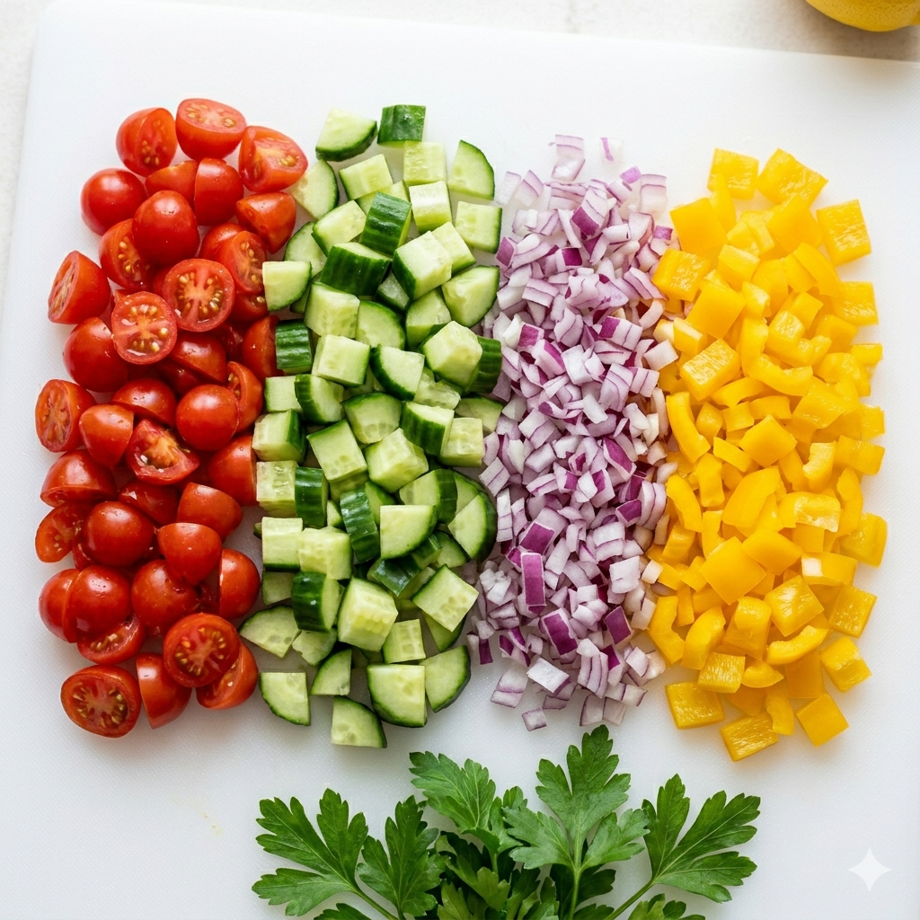 오이와 파프리카는 병아리콩과 비슷한 크기의 큐브 형태로 썰어주세요. 방울토마토는 2등분 혹은 4등분 하여 즙이 잘 어우러지게 합니다.