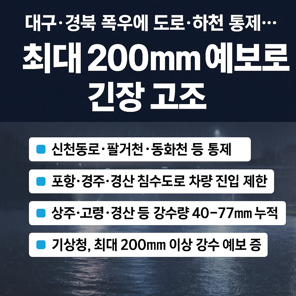 대구시와 경상북도는 비상대응 체제를 유지하고 있으며, 도로 및 하천 주변 접근 금지, 지하차도·저지대 회피, 긴급 문자를 통한 이동 자제 권고가 이어지고 있습니다.