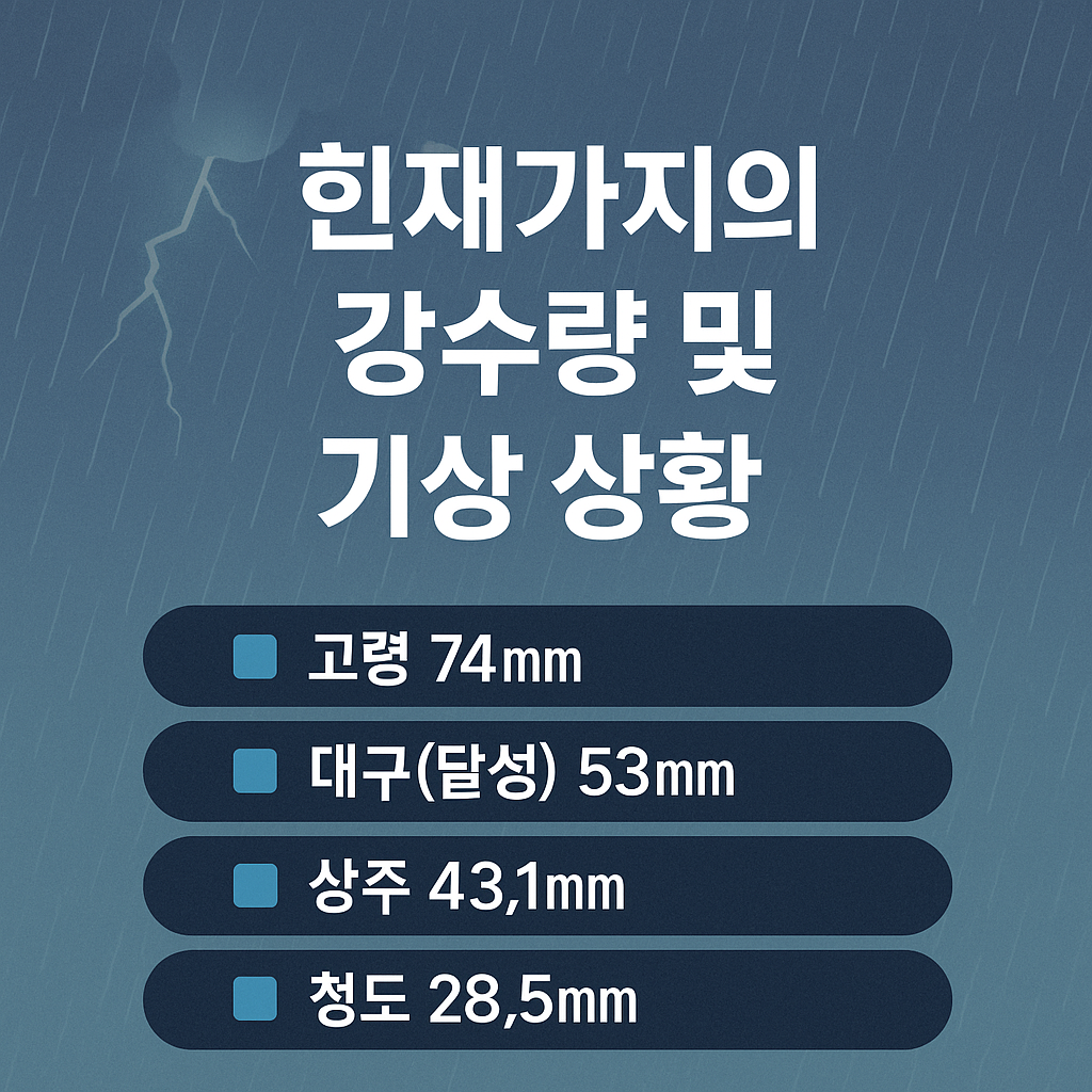 - 호우주의보 발효 중 지역: 대구, 포항, 상주, 고령, 구미, 청도 등 경북 14곳