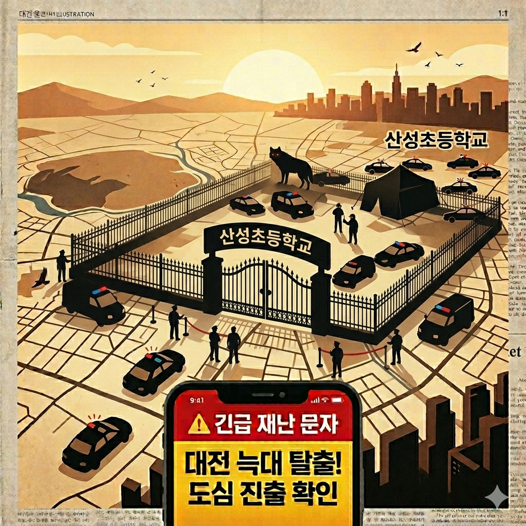 * 지휘 본부 이전: 늑대가 학교 인근에서 목격됨에 따라, 현장 지휘소를 산성초등학교로 신속히 옮겨 하교 시간 학생 안전 확보와 수색 작전을 통합 지휘하고 있습니다.