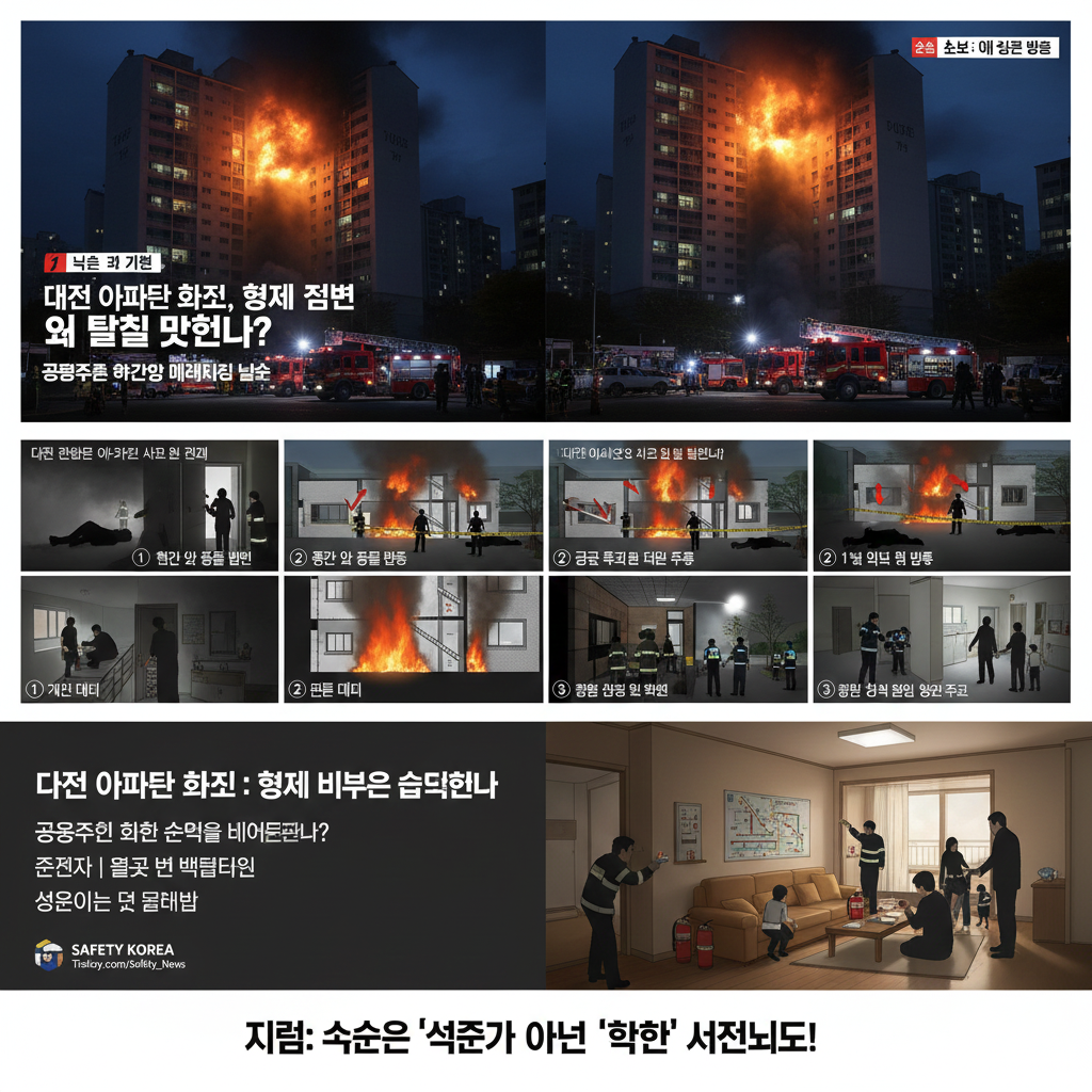 본 포스팅에서는 대전 아파트 화재 사건의 상세 경위와 함께, 소방 전문가의 시각에서 분석한 '고층 아파트 화재 시 인명 피해 발생 원인' 및 '생존을 위한 필수 대피 전략'을 심도 있게 다루어 보겠습니다.