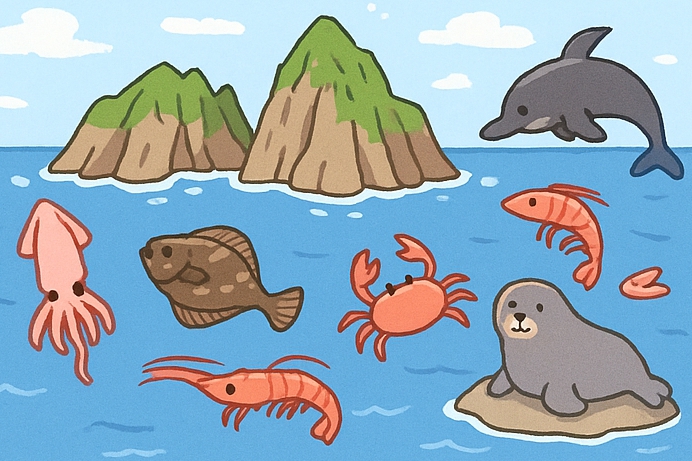 이 변화 덕분에 플랑크톤과 영양 염류가 풍부하고, 오징어·명태·전복·해조류·새우 등