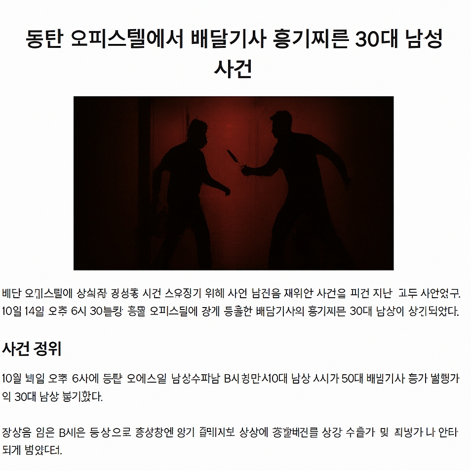 지난 10월 14일 저녁, 경기도 화성시 동탄신도시 오산동의 한 오피스텔 복도에서 예기치 못한 흉기 사건이 발생했습니다.