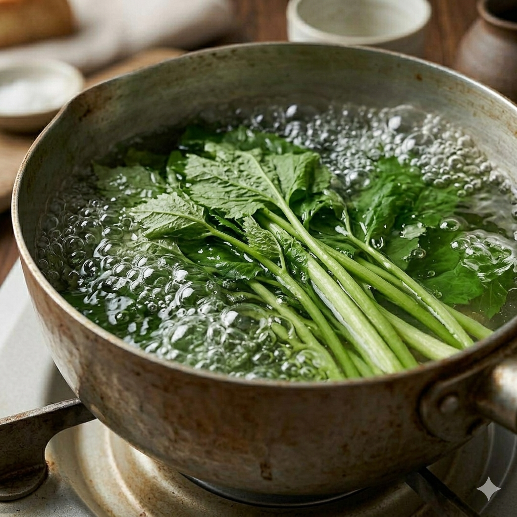 끓는 물에 소금을 한 큰술 넣고 머위를 줄기부터 넣어 약 2~3분간 데칩니다. 데친 머위는 즉시 찬물에 헹궈 열기를 빼야 색감이 살아납니다. 만약 머위의 쓴맛이 너무 강하다면 찬물에 30분 정도 담가두는 것이 요령입니다.