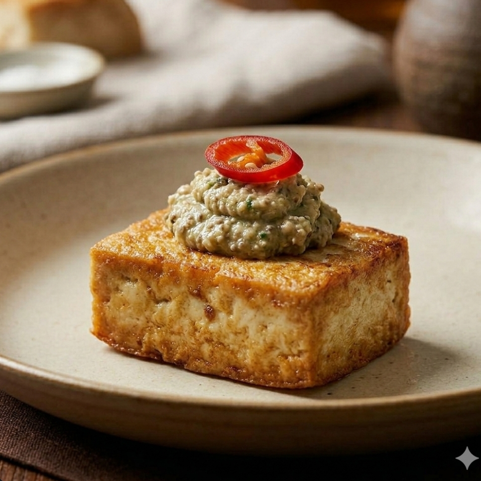 고급 한정식 느낌을 내고 싶다면, 넓은 평접시의 중앙에 노릇한 두부부침을 가지런히 겹쳐 올리고, 그 옆이나 위에 소복하게 머위나물을 곁들여 보세요.