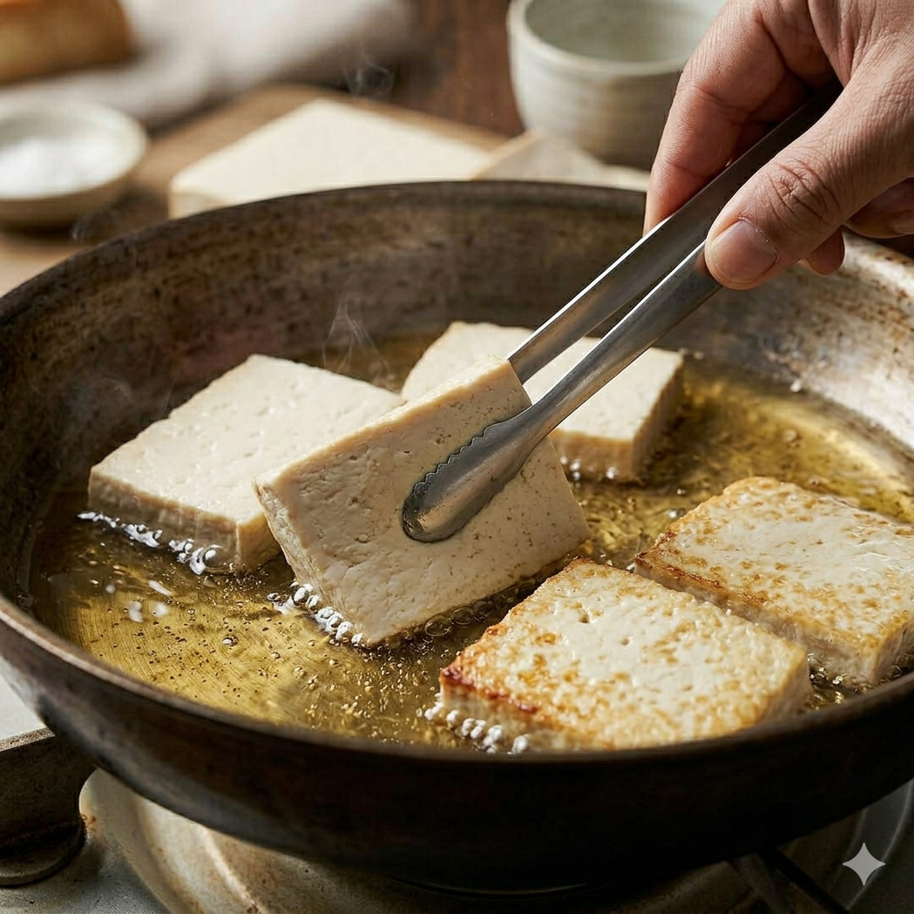 팬을 달군 후 식용유와 들기름을 섞어 두릅니다. 전분가루를 얇게 입힌 두부를 올리고 중약불에서 은근하게 구워줍니다. 전분가루는 두부의 수분을 잡아주어 겉은 과자처럼 바삭하고 속은 푸딩처럼 촉촉한 '겉바속촉' 식감을 만들어줍니다.