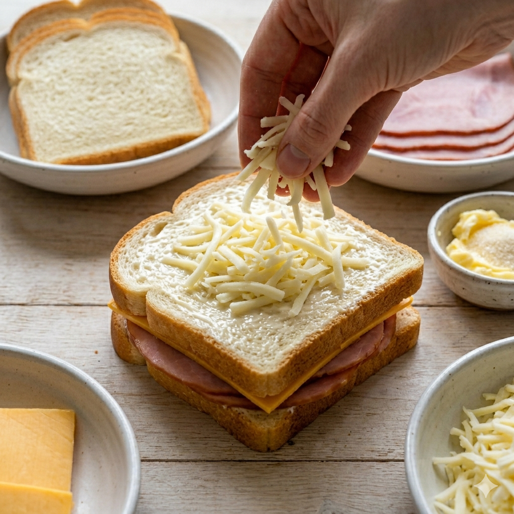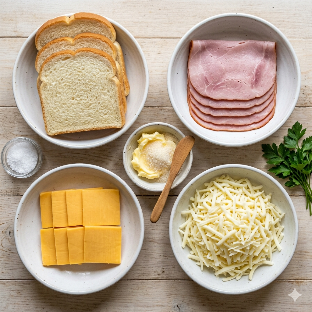 * 메인 재료: 식빵 4장 (우유 식빵 권장), 슬라이스 햄 4~6장, 체다치즈 4장, 모짜렐라 치즈 100g.