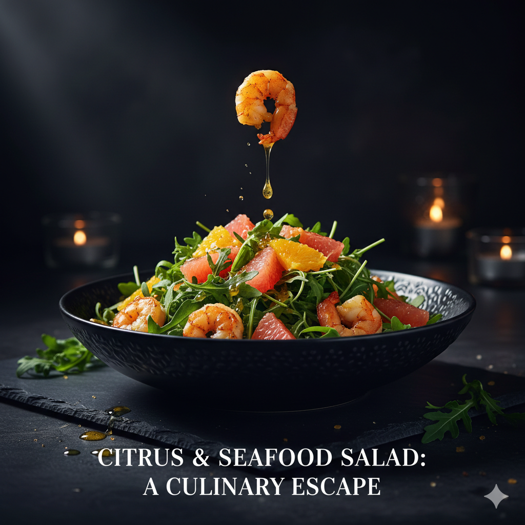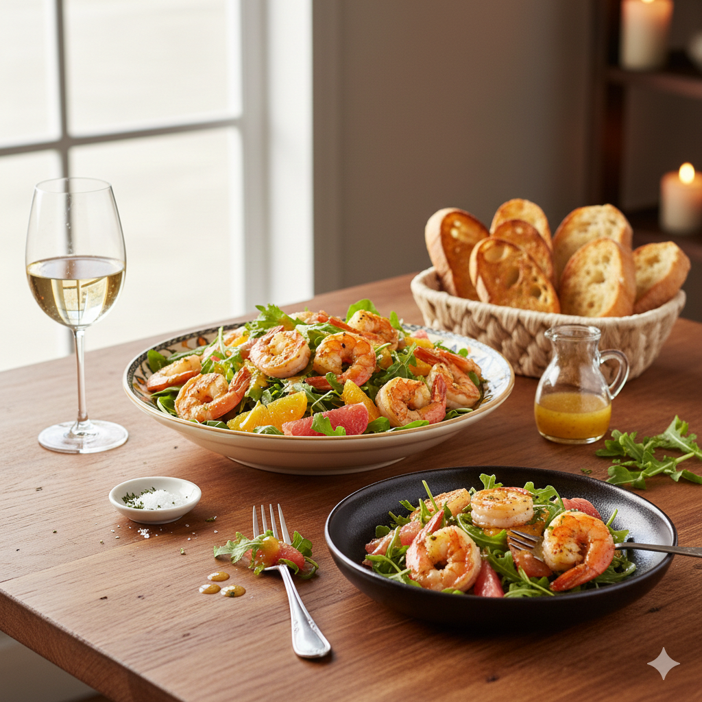 바로 '마늘 향을 입힌 탱글한 새우 구이'와 상큼함의 정점인 '오렌지·자몽 시트러스 드레싱 샐러드'의 조합입니다.