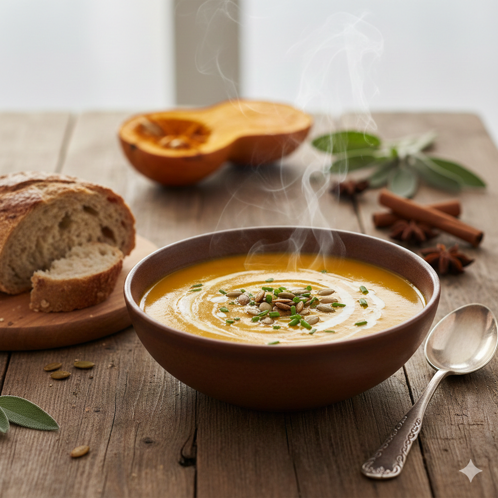 정성이 가득 담긴 구운 단호박 스프 한 그릇으로 몸과 마음을 데워보세요.