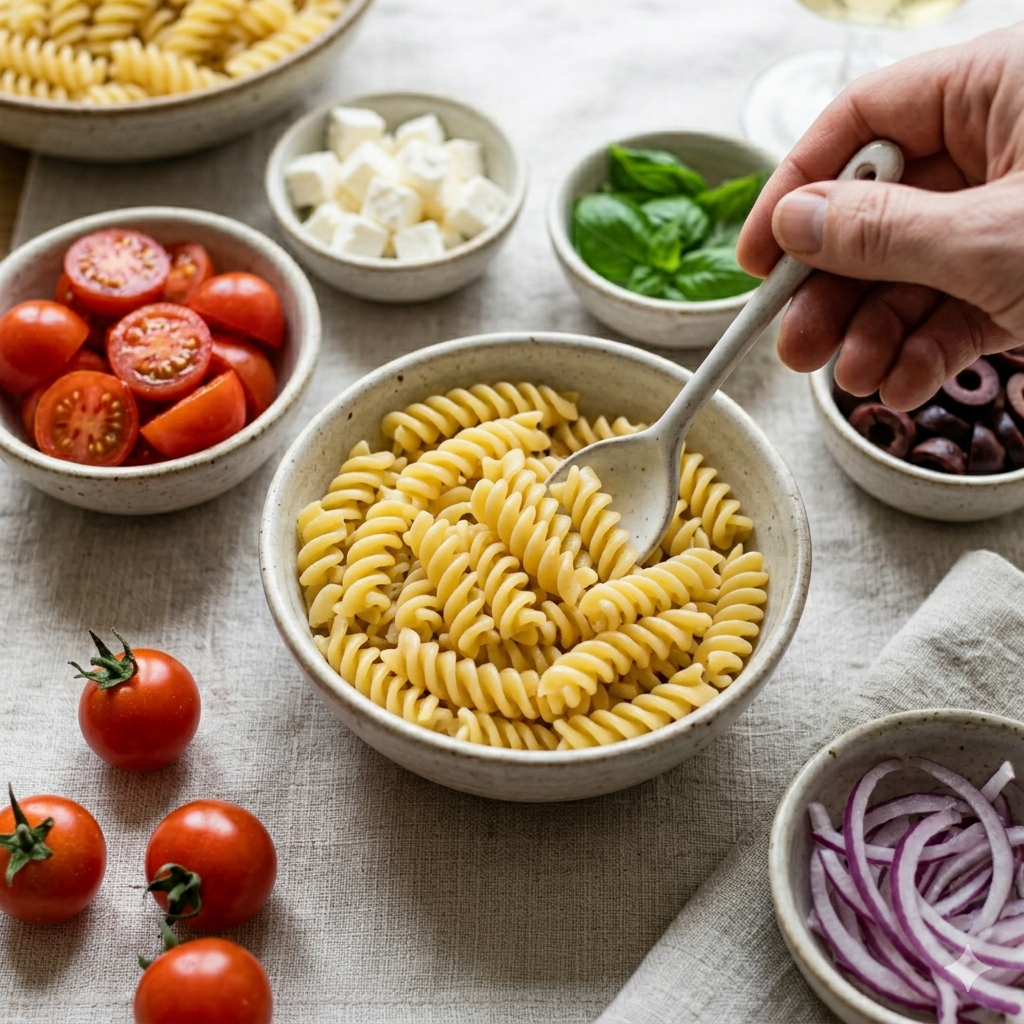 냉파스타용 면은 평소보다 1~2분 더 삶는 것이 포인트입니다.