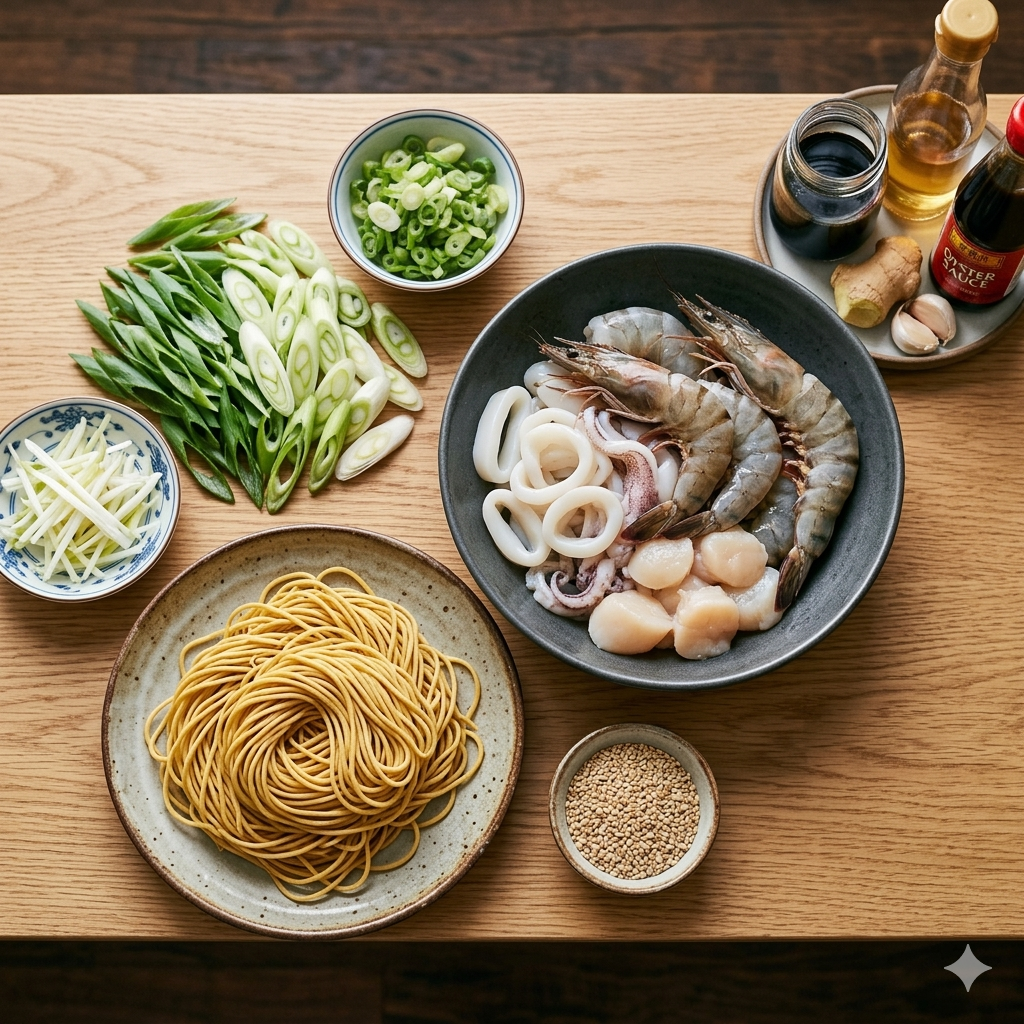 * 메인 재료: 중화면(또는 라면 사리) 2개, 대파 2대(흰 부분과 초록 부분 모두 사용), 냉동 해물 믹스 1컵, 칵테일 새우 8~10마리.