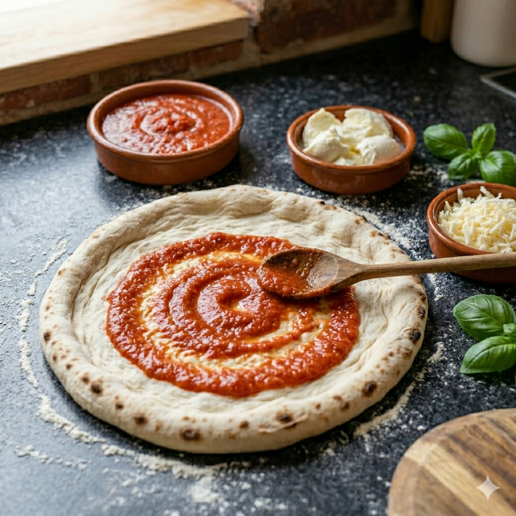 2. 도우 위에 식혀둔 토마토 소스를 넉넉히 바릅니다.